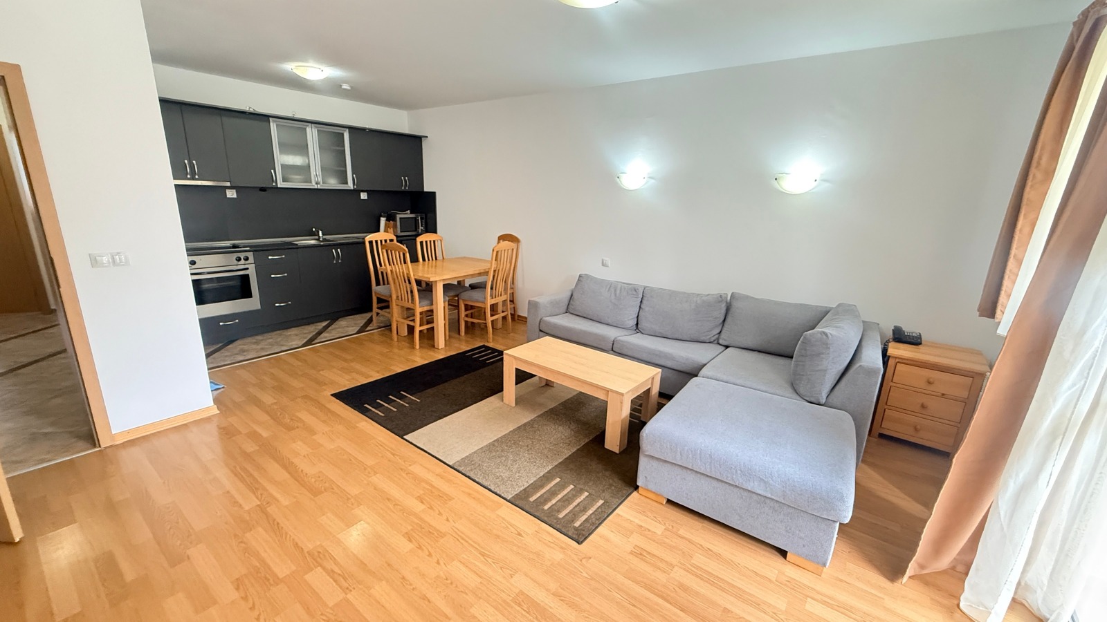 Кухня с всички електроуреди и дневна зона с разтегателен диван