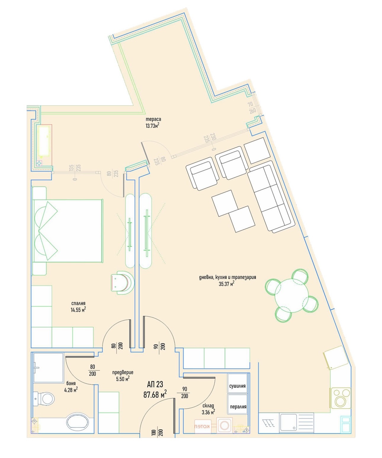 Чиста площ: 87,68кв.м