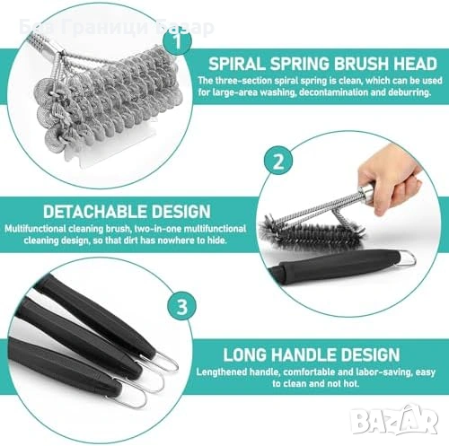 Четка за почистване на скара с 3 реда неръждаеми косъмчета и стъргалка