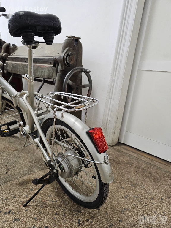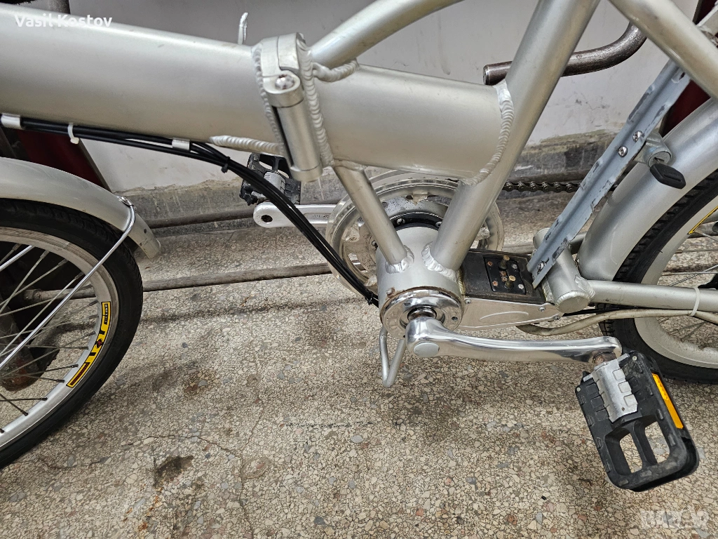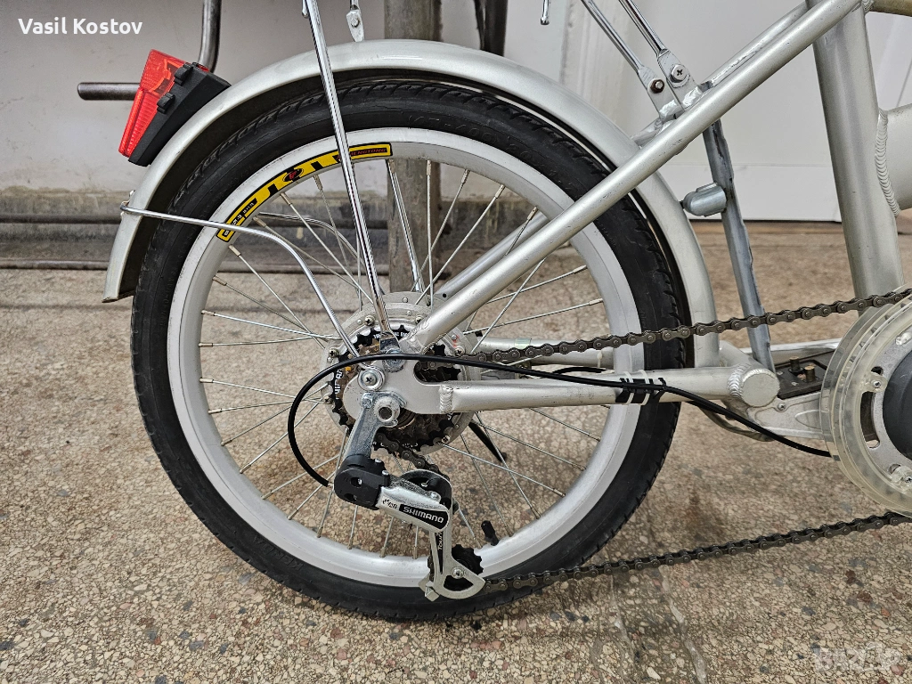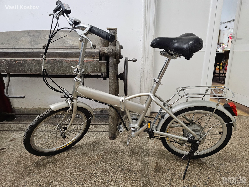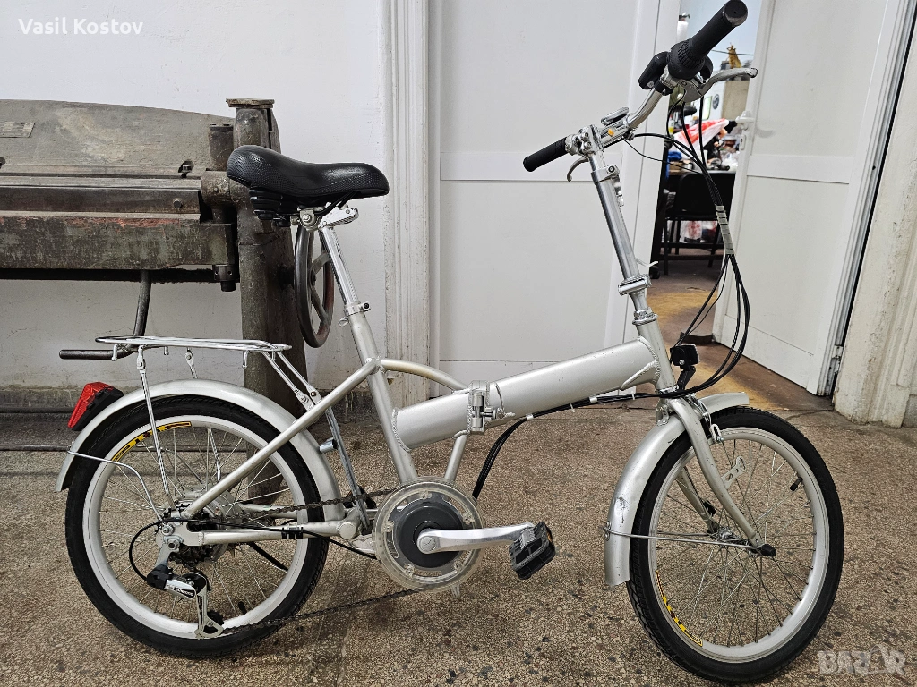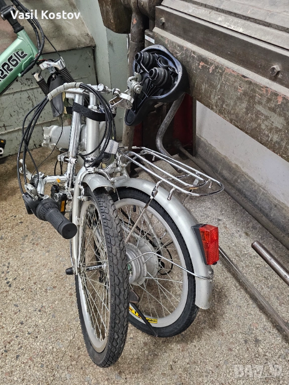Колелото е с мотор на 24V . Функцията му е да подпомага карането. Батерията съм я загубил. Продават се в aliexpress модели точно като за този вид монтаж със шейна . Може да се ползва и като класически велосипед без батерия. Много леко се въртят педалите защото има някаква редукция при педалите освен скоростите. Задната спирачка е барабанна а не с колодка като отпред. Сгъва се и става много компактно както се вижда на снимките