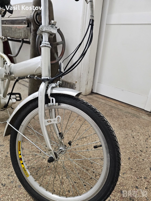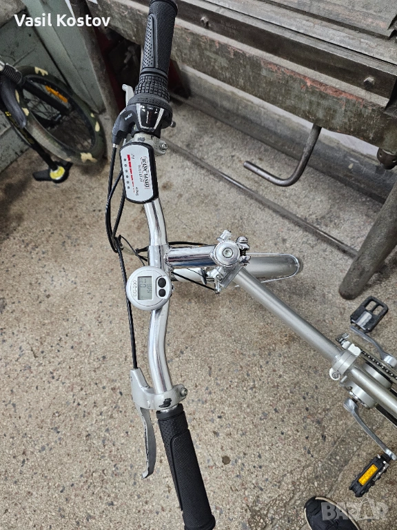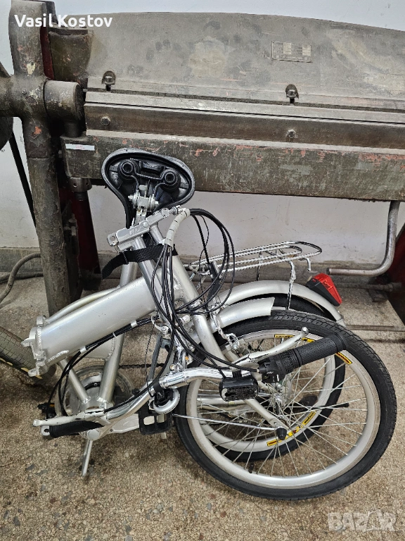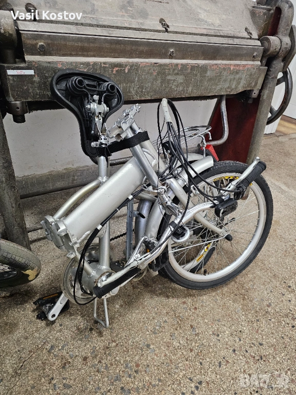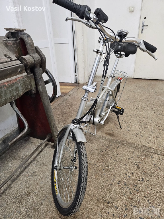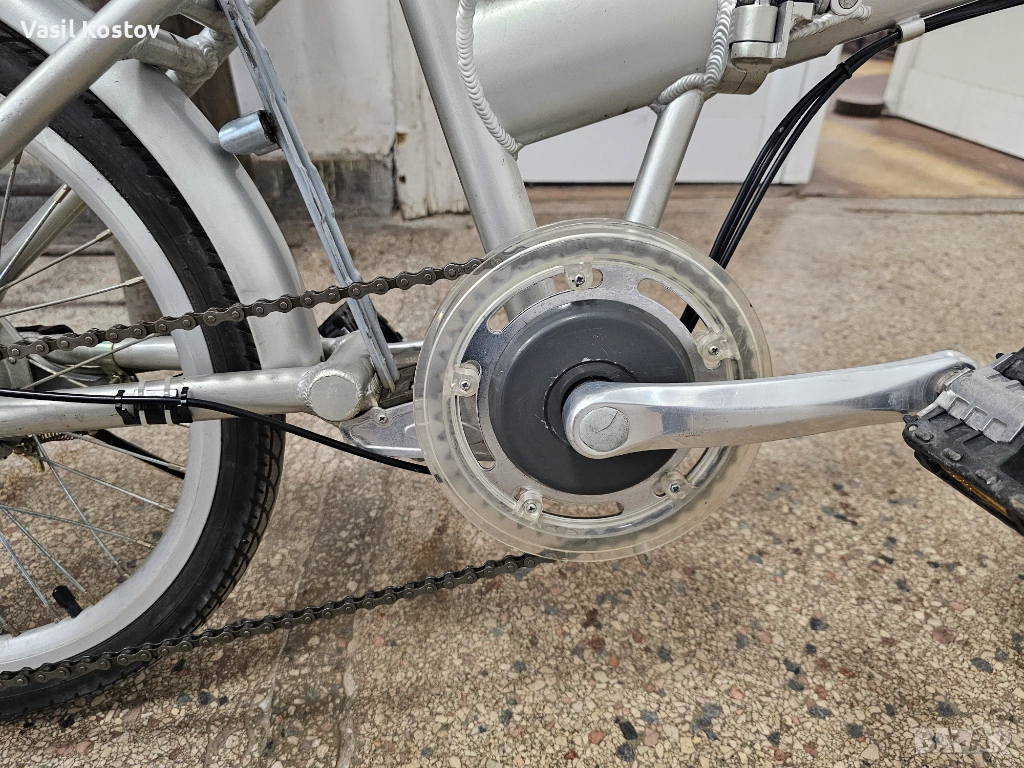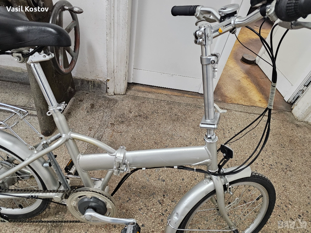 Колелото е с мотор на 24V . Функцията му е да подпомага карането. Батерията съм я загубил. Продават се в aliexpress модели точно като за този вид монтаж със шейна . Може да се ползва и като класически велосипед без батерия. Много леко се въртят педалите защото има някаква редукция при педалите освен скоростите. Задната спирачка е барабанна а не с колодка като отпред. Сгъва се и става много компактно както се вижда на снимките