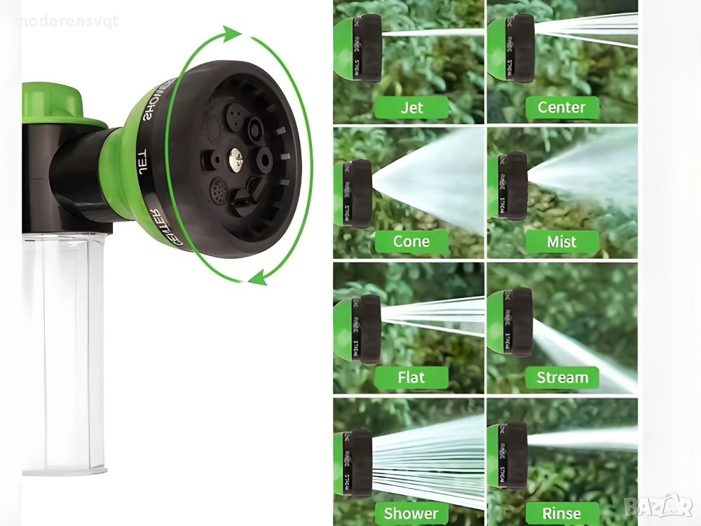 Комплектът включва воден пистолет с резервоар за препарат, което улеснява нанасянето на пяна и почистващи препарати. Регулируемата струя ви позволява да персонализирате интензитета на почистване според вашите текущи нужди.