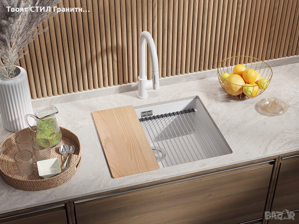 Черното е един от най-впечатляващите цветове за модерна кухня. Тази черна кухненска мивка стои отлично със светли плотове, дървесни декори, бетонни текстури, камък и смесители в черно или инокс. Цветът добавя дълбочина, контраст и по-луксозно излъчване, а в комбинация с вграждане под плот ефектът е още по-чист и по-премиум. Ако искам мивката да бъде силен дизайнерски акцент, черният вариант е много добър избор.