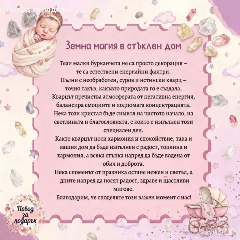 ​Търсите нещо по-различно от стандартните сувенири? Нашите малки бурканчета с естествен кварц са символ на чистотата и светлината, с които идва всяко дете.