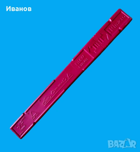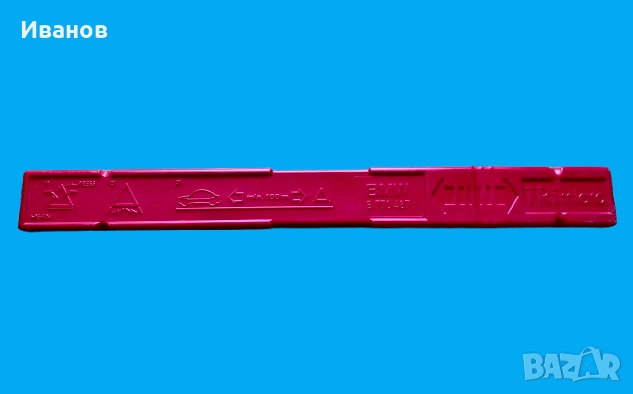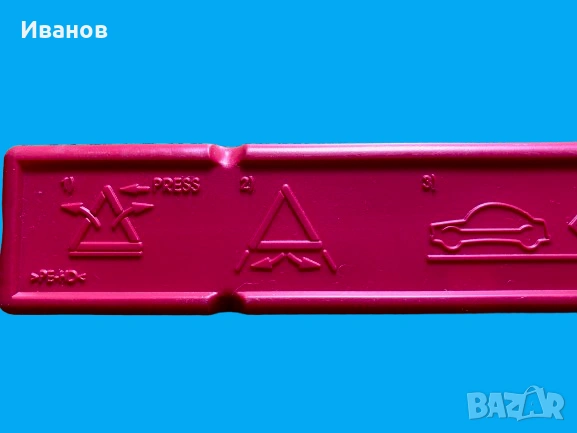 Оригинален авариен триъгълник за BMW в неговата защитна червена пластмасова кутия. Тези триъгълници са стандартно оборудване за безопасност за много модели на BMW и често са проектирани да се съхраняват в специфични отделения в багажника на автомобила.