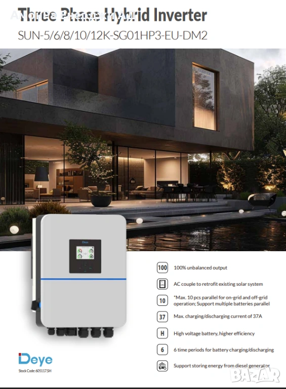 Високоволтов трифазен хибриден инвертор DEYE 12 5W, 2 MPPT, 10 години гаранция