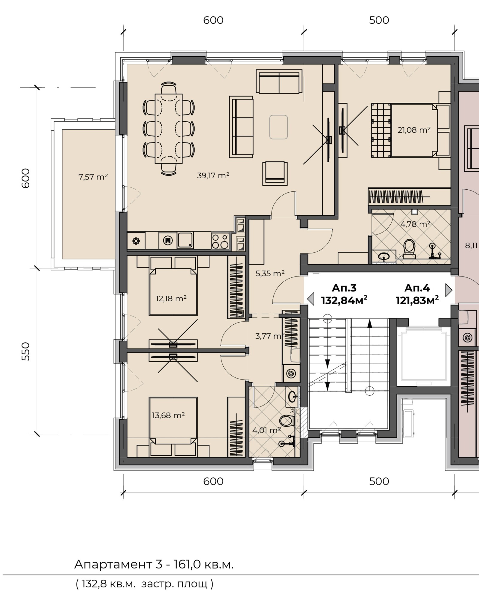Представяме ви нова БУТИКОВА жилищна сграда само с 6 апартамента във в. з. Симеоново-Драгалевци. В непосредствена близост са спирка на автобуси, бъдещия заведения и множество детски градини, няколко училища и магазини. Сградата разполага с два четиристайни апартамента за продажба с възможност за закупуване до 3 паркоместа към всеки имот. Обявената цена е апартамент 3, състоящ се от входно антре, дневна с кухненски бокс и трапезария, родителска спалня със собствена баня с тоалетна,втора баня с WC, две детски спални и балкон, находящ се на 2-ри етаж - ЗП - 132,84 кв.м.; ОЗП - 160,96 кв.м.; Има възможност за закупуване на до 3 броя подземни и/или наземни паркомяста към имота.