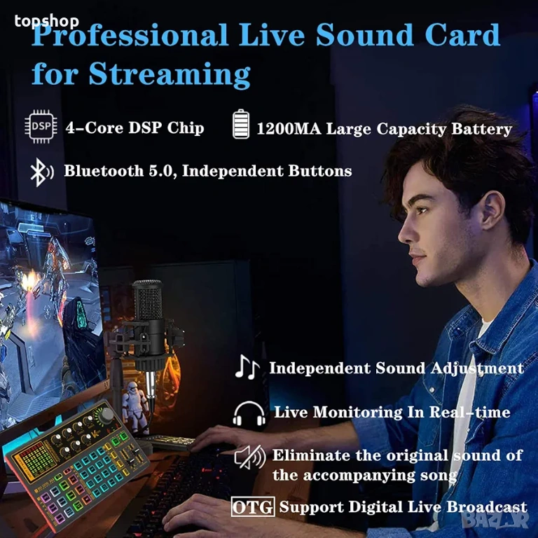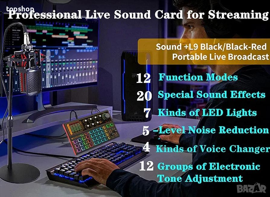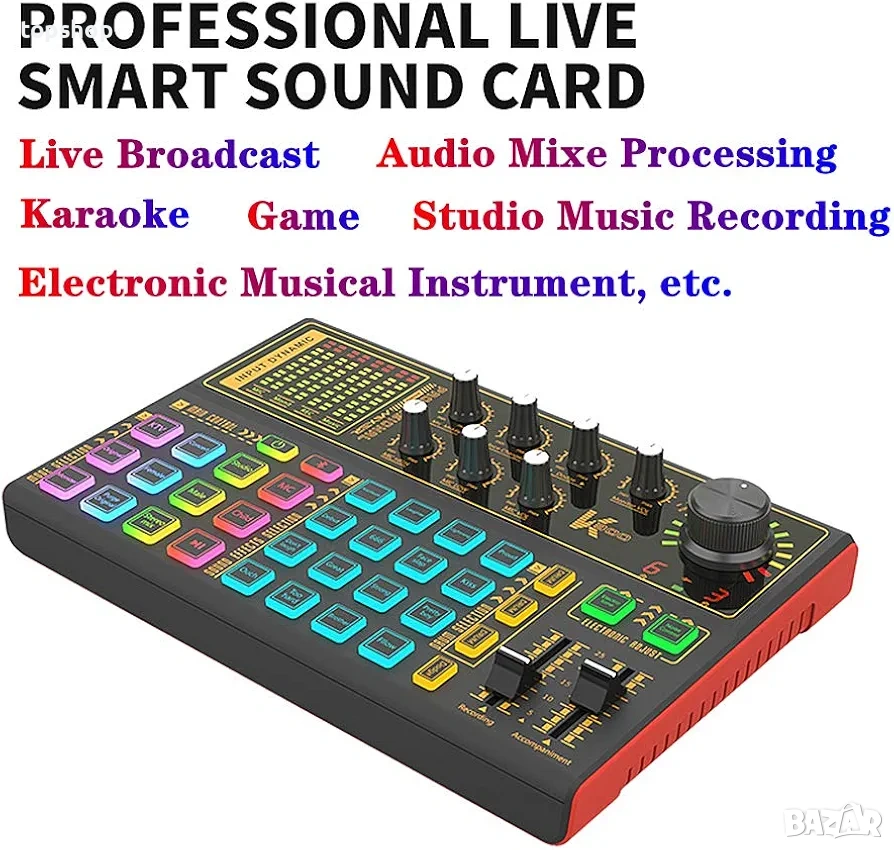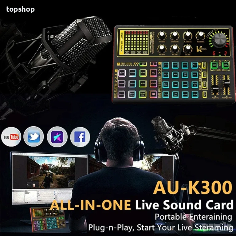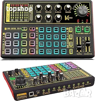 Продавам многофункционална звукова карта и аудио миксер модел K300. Идеален избор за стрийминг в TikTok, YouTube, Facebook, гейминг, подкасти или онлайн караоке. Устройството предлага богат набор от ефекти и професионално звучене на достъпна цена.
