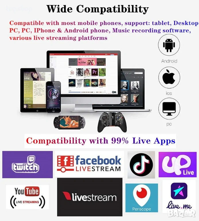 Съвместим с Android, Apple устройства, компютри, PS4 и други конзоли.