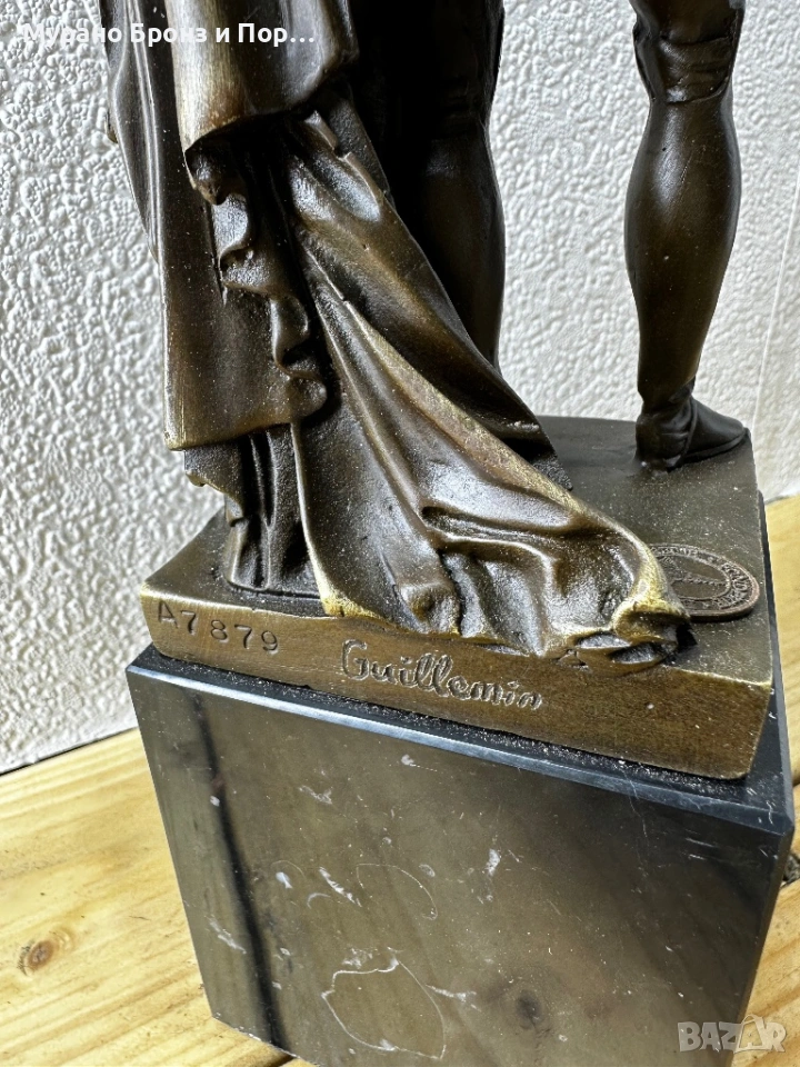 • Материал: Фигурата е излята от висококачествен бронз с прецизна детайлност, поставена върху масивна основа от черен мрамор.
