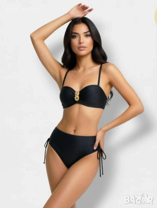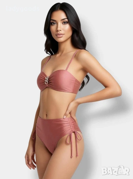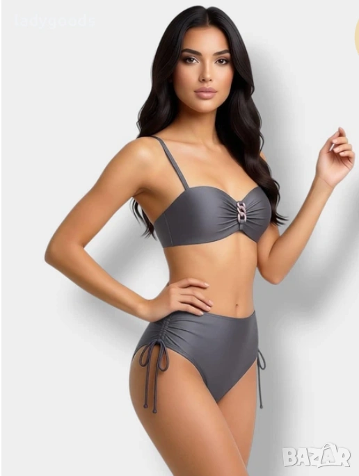 Красив бански костюм с изящен блясък и красива кройка,която ще ви позволи да се чувствате комфортно и удобно на плажа.Горната част тип „Бриджитка“ с ефектни аксесоари.Тънки презрамки, които могат да се свалят за равномерен тен. Бански с висока талия. Банските костюми са с регулируема ширина бикината. Подплата отпред и отзад. Оформена чашка,плътна,без повдигане. Чашките с банели, поддържат добре и събират добре гърдите. Гъвкави странични банели в страничните шевове.С метална закопчалка на гърба. Презрамките са с регулируема дължина и се свалят.