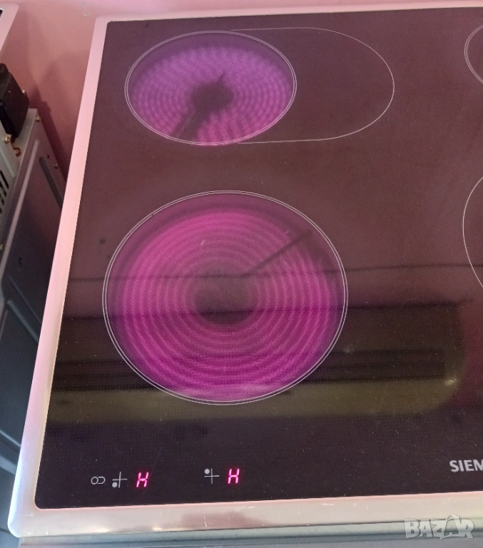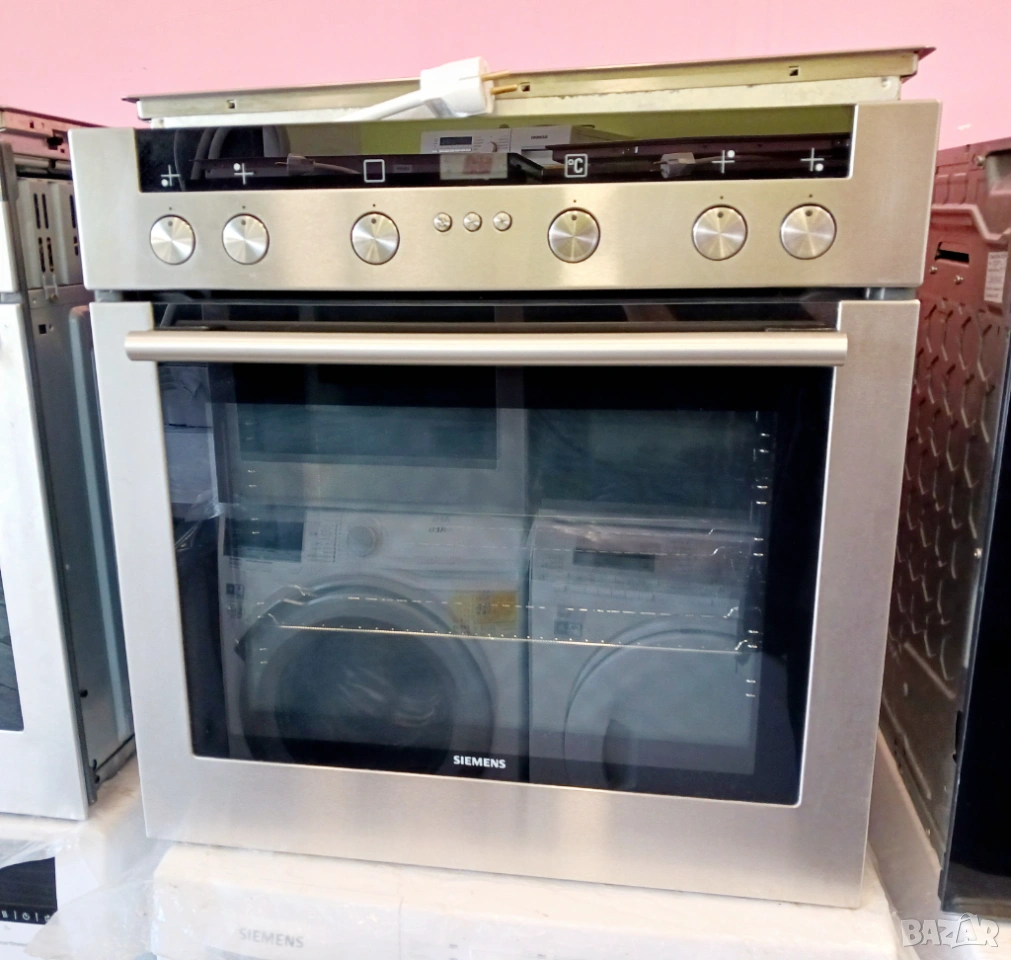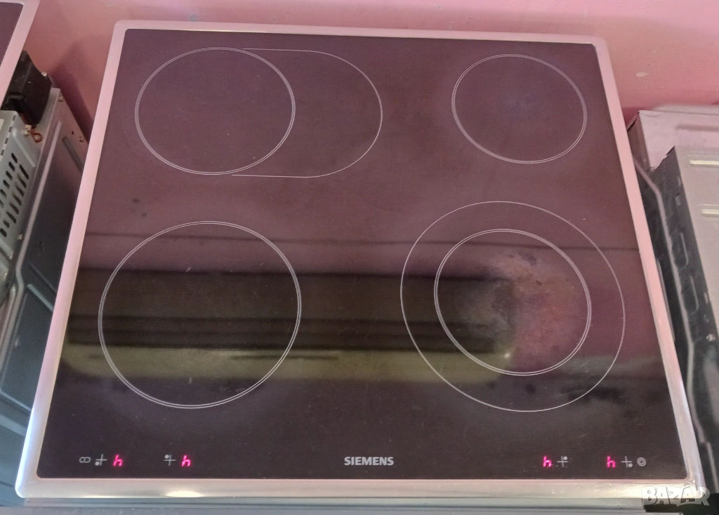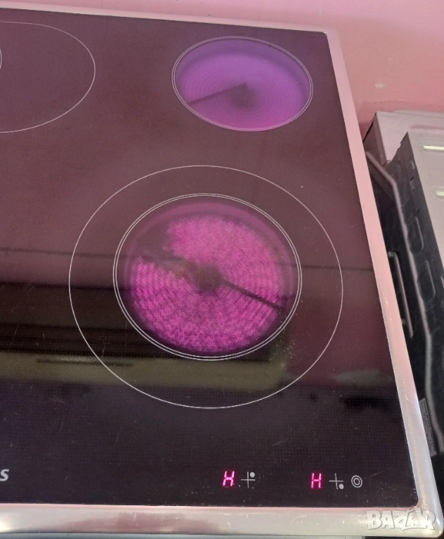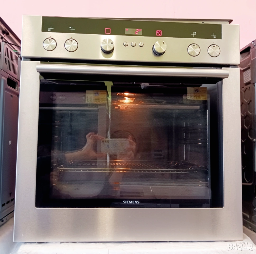 Печка за вграждане SIEMENS, произведена в Германия / цвят - инокс / с пуш бутони и LCD дисплей / фурната е с вратичка тип студено стъкло и каталитично почистване на задния панел. Има 9 функции (грил, вентилатор, конвекция, размразяване, бързо достигане на температурата и др.) / котлоните са с 9 степени / плота е с 4 котлона, 2 разширения (сензорни), индикатори за остатъчна топлина и метален кант.