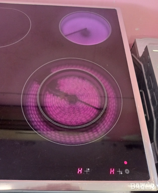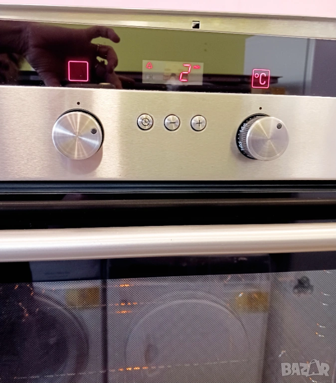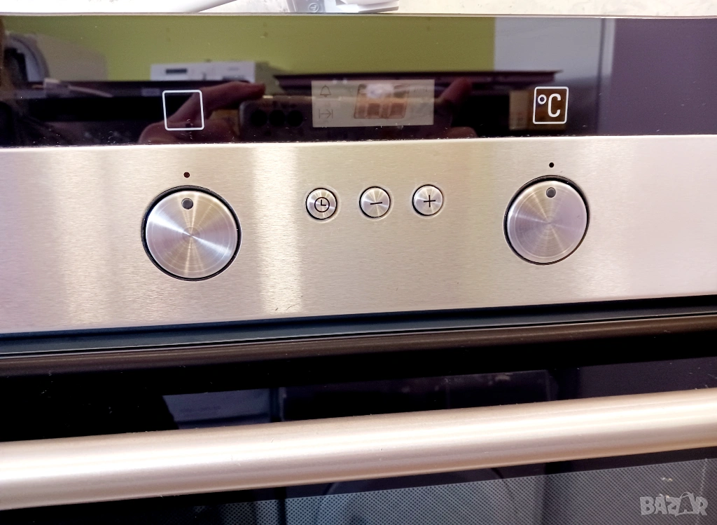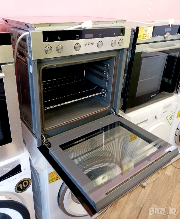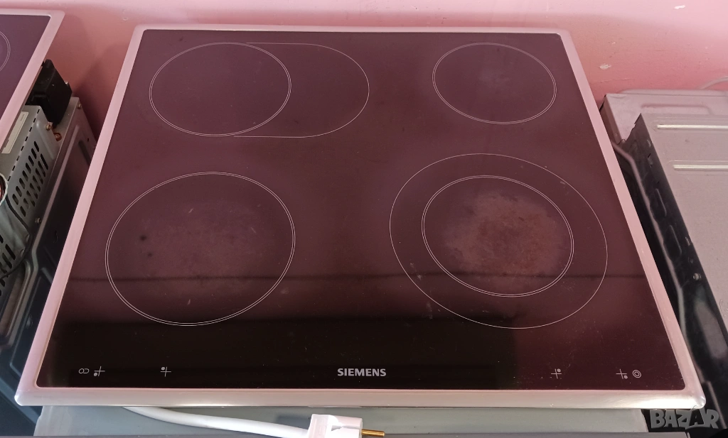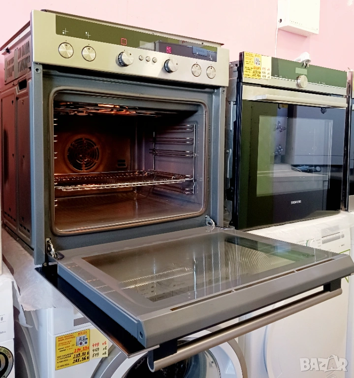 Печка за вграждане SIEMENS, произведена в Германия / цвят - инокс / с пуш бутони и LCD дисплей / фурната е с вратичка тип студено стъкло и каталитично почистване на задния панел. Има 9 функции (грил, вентилатор, конвекция, размразяване, бързо достигане на температурата и др.) / котлоните са с 9 степени / плота е с 4 котлона, 2 разширения (сензорни), индикатори за остатъчна топлина и метален кант.