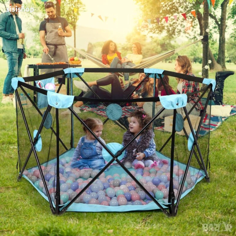 Мобилен детски манеж за игра у дома и в градинатае прекрасен и практичен подарък, който ще зарадва всяко семейство. Превърнете хола или ливадата пред къщи в истински увеселителен парк! Тази голяма шестоъгълна кошара предлага изобилие от място за играчки, топки и забавления, като същевременно държи детето в защитена и контролирана зона.