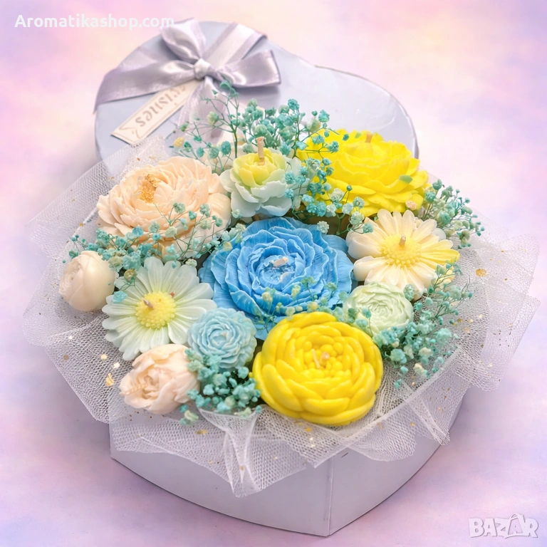 Слънце и Небе е ръчно изработен соев букет, който съчетава свежите небесносини нюанси с топлите жълти и кремави акценти – композиция, вдъхновена от светлината на лятното небе и меките слънчеви лъчи. Хармонията между пастелните тонове и фината декоративна мрежа създава усещане за лекота, простор и елегантност.
