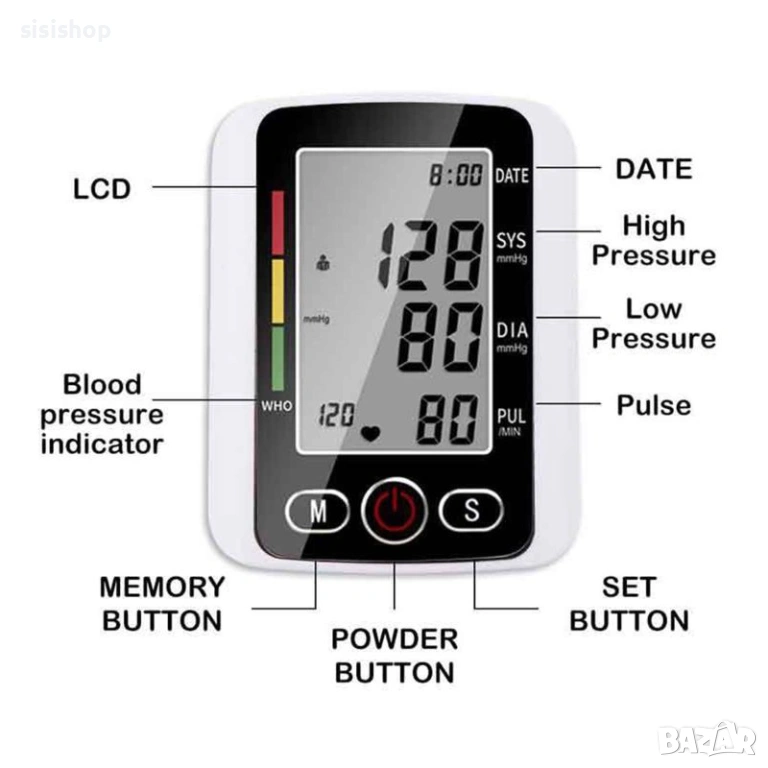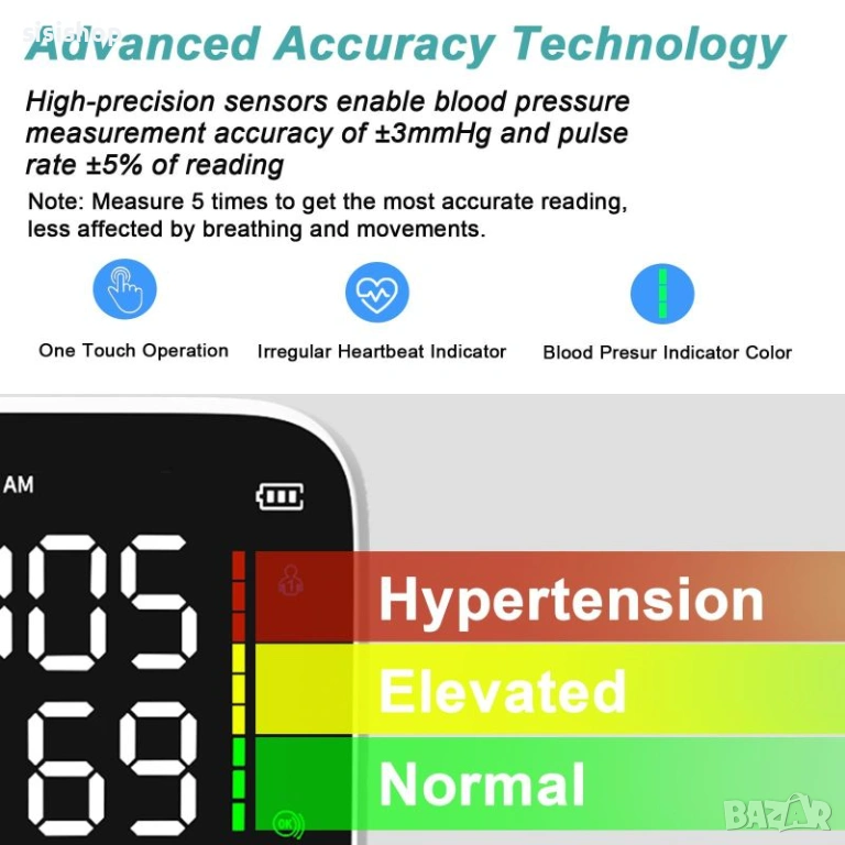 Функционалност: Измерва едновременно кръвно налягане и пулс.