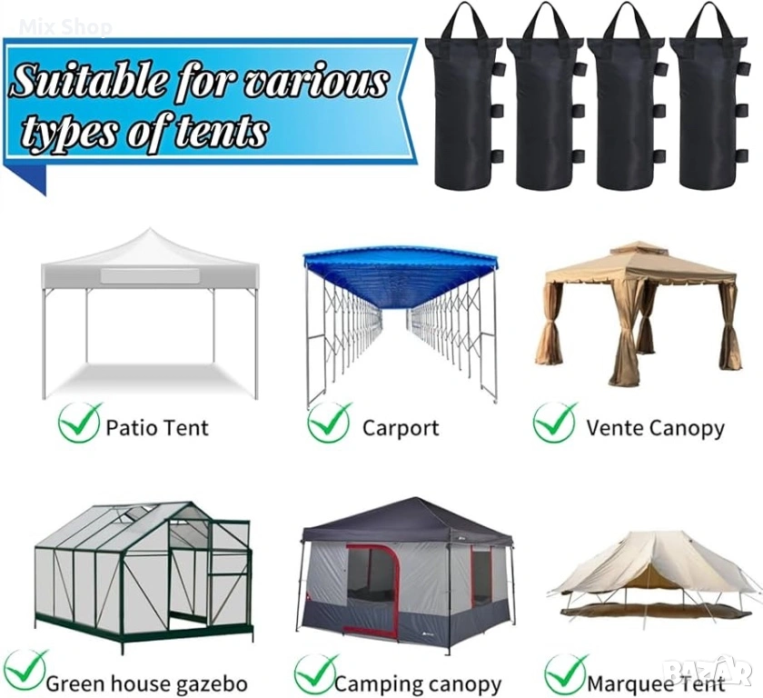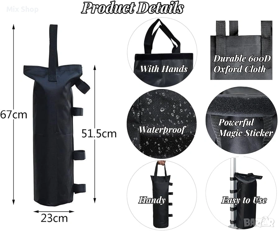 Широко използвани, торбите за тежести за краката на сенника са задължителни за къмпинг, разходки с багаж, пикници, фестивали, пазари на открито, партита, барбекюта, спортни събития, плажа и навсякъде другаде, където би ви бил необходим сенник или палатка.