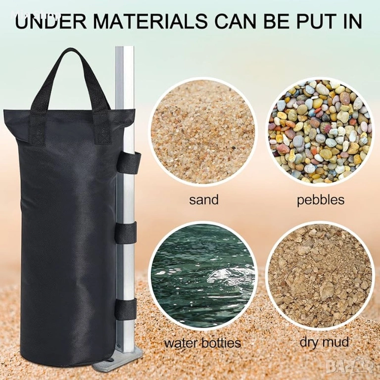 Голям капацитет - Размерът е 67x23 см. Всяка торба с тежест за сенник може да побере до 25-30 фунта обикновен пясък. Може да осигури перфектно фиксиране, за да устои на силни ветрове. Подходяща за всякакъв вид беседка, палатка, навес, навес за кола, плажен чадър, сенник и др.