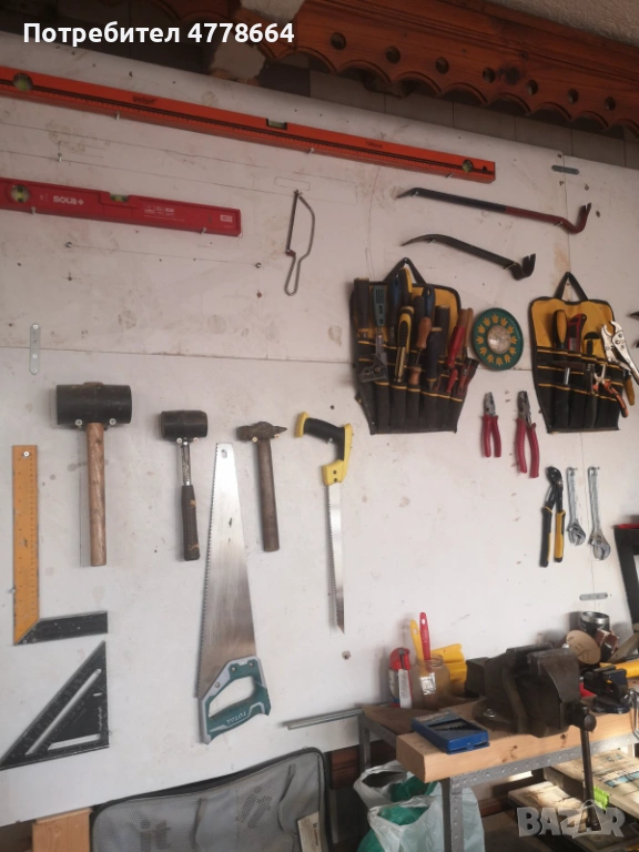 7. Комплект от Над 15 Висококачествени Ръчни Инструменти: Включва длета, чукове, отвертки, нивелири, ножовки, клещи и други, подредени на стена и в държачи.