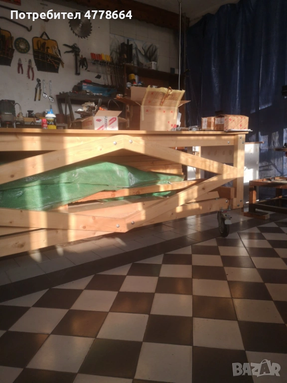 15. Дървена Работна Маси на Колела: Две стабилна дървена маса с колела за лесна мобилност.