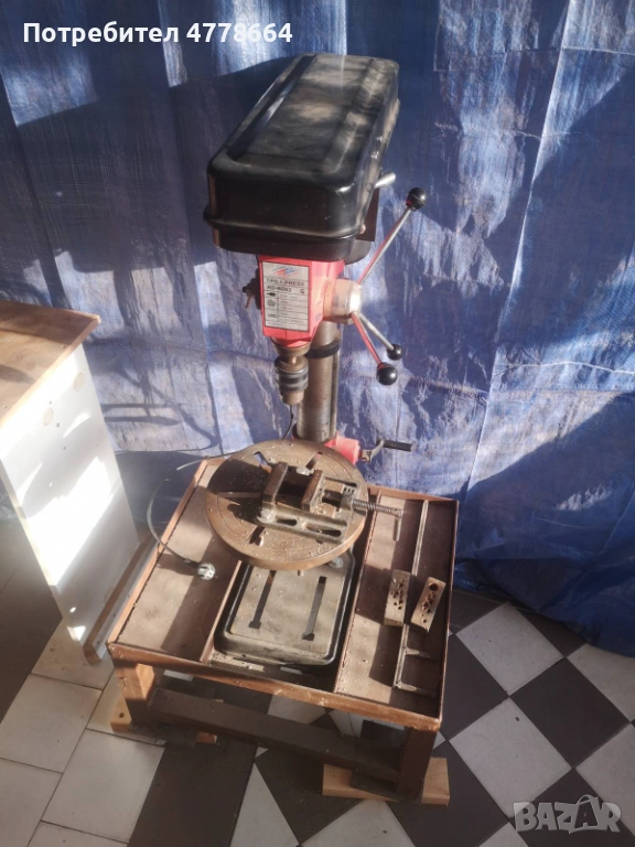 Настолна Бормашина: С червен корпус, черна защитна капачка и здрава работна маса на стабилна метална стойка.