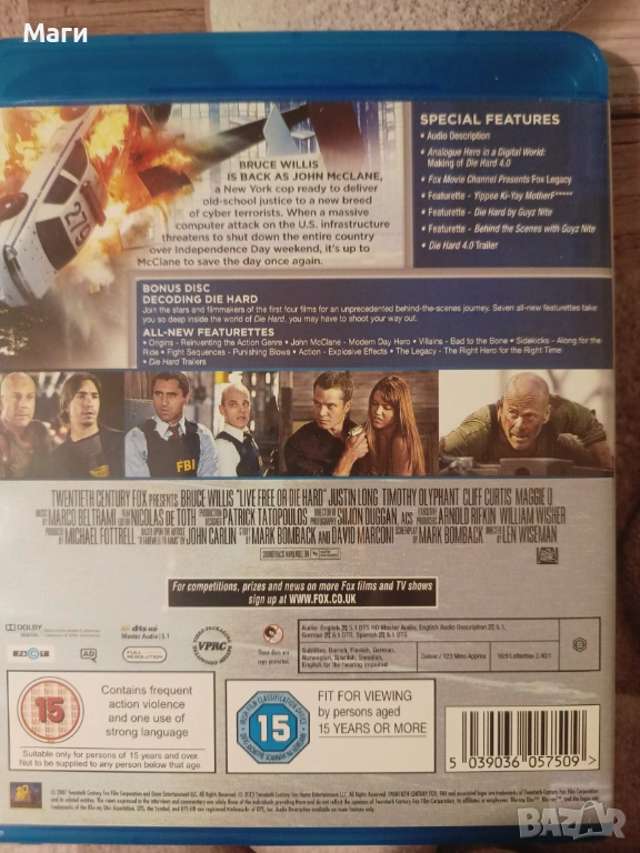 Продавам от личната си колекция на Блу Рей диск филма - " Live Free or Die Hard (Умирай трудно 4.0 ) без Бг субтитри има и втори допълнителен диск с много допълнителни материали за филма ( 90 минути) . Има английски език и английски субтитри със Full HD 1080p картина и DTS HD MASTER AUDIO звук.