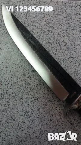 . Допълнително щампованите фигури в горната част на острието придават стил и завършеност на дизайна на този модел. Добавените гард и помел осигуряват захвата и предпазват ръката. Дръжката е с анатомична форма, изработена от материал, наподобяващ тъмно дърво. Ножът е окомплектован с подходяща пластмасова кания – много надеждно и здраво изработена. Канията е с пригодена за поставяне на колан. С помощта на велкро лепенка се фиксира ножа.