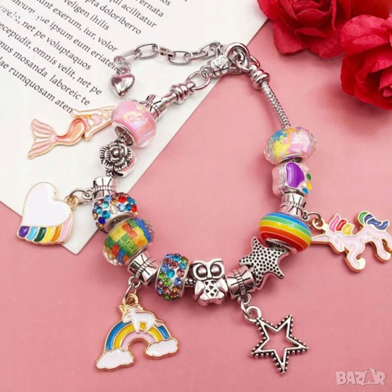 Търсите перфектния подарък за рожден ден или празник? Този розов комплект за бижута "Princess" е готов за подаряване, пристигайки с луксозна чантичка и стилна кутия. Той е специално създаден за деца над 3 години, като стимулира креативността и концентрацията по забавен начин. Сглобяването на гривните е лесно и не изисква инструменти – просто развийте капачката на основата, нанижете избраните талисмани и затворете. Висококачествените материали и детайлните метални елементи придават на готовите бижута професионален и модерен вид, който всяка малка дама ще носи с гордост.