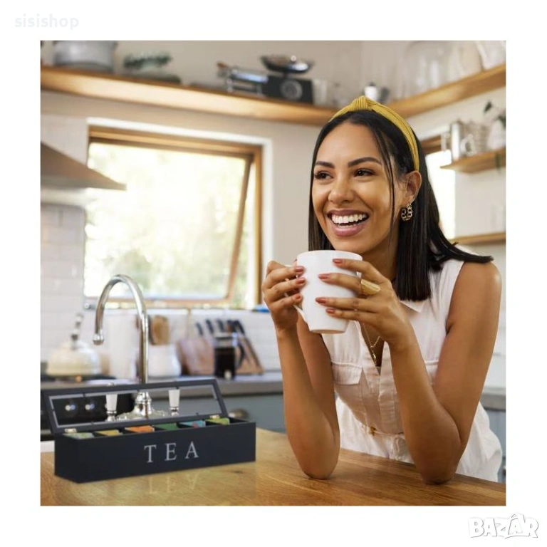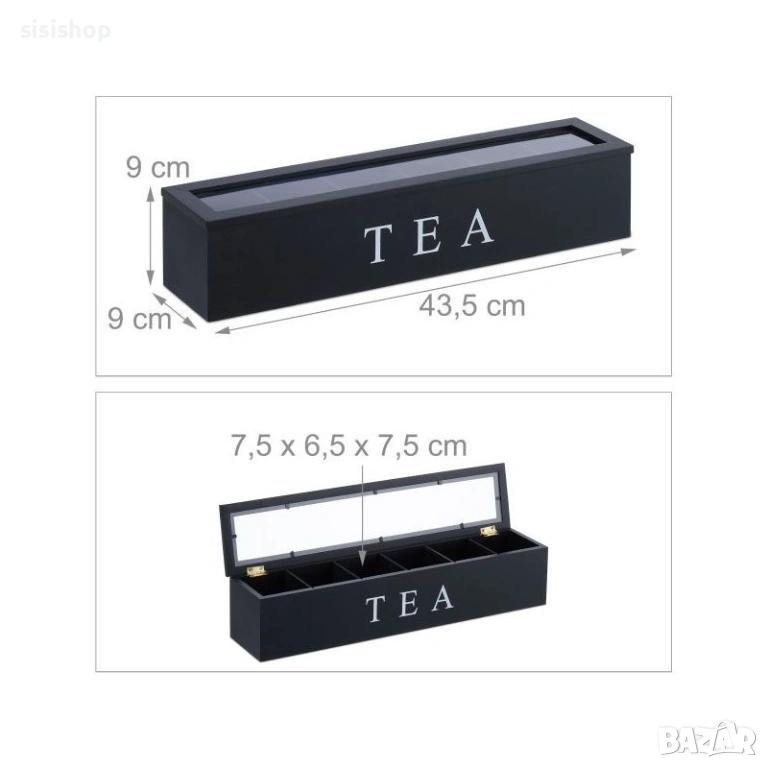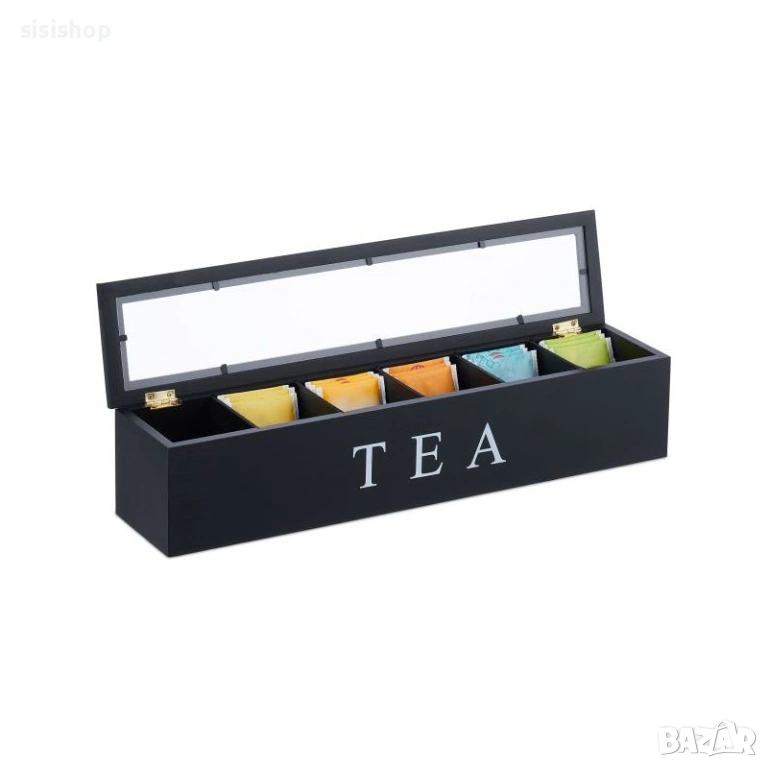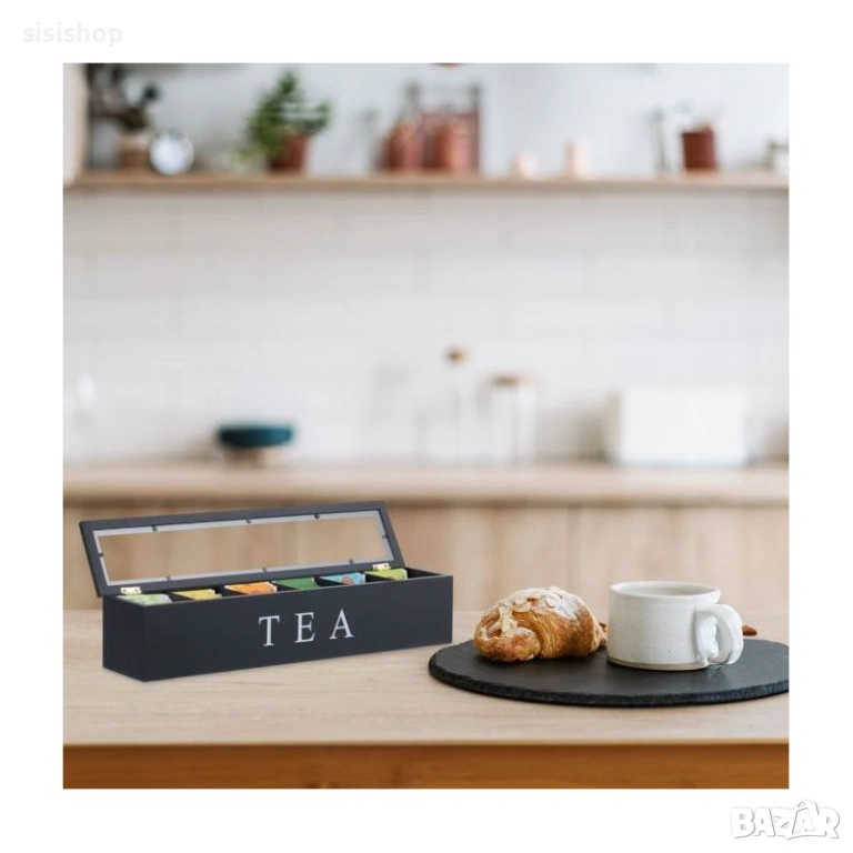 Организирайте кухненския си плот с лекота чрез този компактен и практичен дървен органайзер. Тази кутия с 6 отделения е създадена не само за пакетчета чай, но е изключително удобна и за съхранение на капсули кафе, захарчета, малки опаковки подправки или други дребни аксесоари. Изработена от здрава дървесина с устойчиво черно покритие, тя гарантира дълготрайна употреба и лесна поддръжка. Стилният ѝ силует заема минимално място, като същевременно побира голямо количество продукти. Идеално решение за поддържане на ред в шкафа или като акцент върху трапезната маса, съчетаващ функционалност и модерна визия.