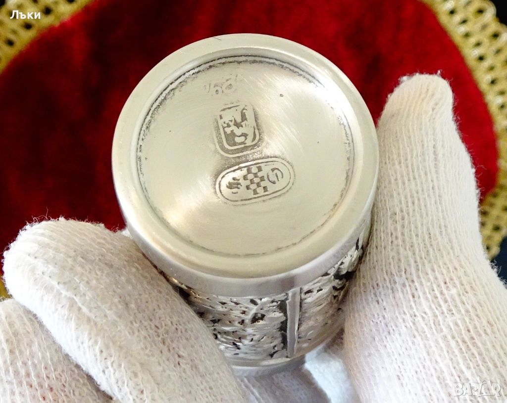 калай и 5% сребро,маркирана с печат на производителя.Декорирана с релефно
