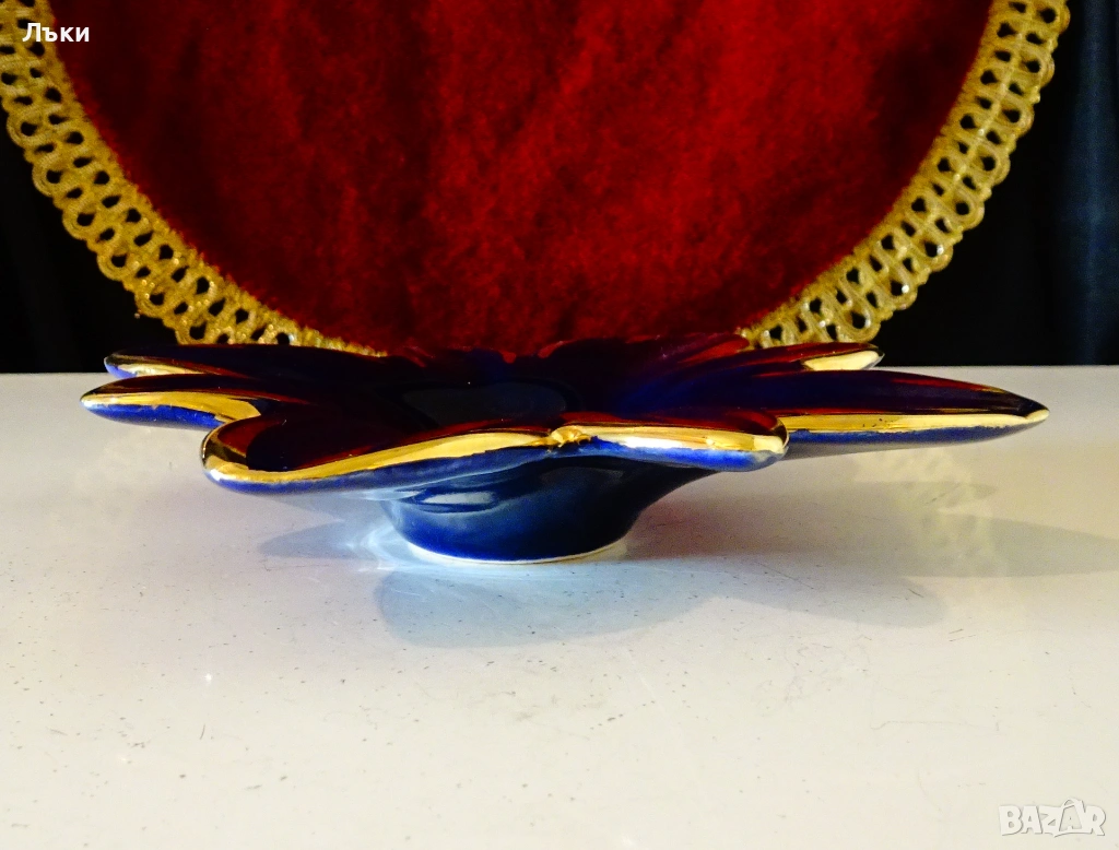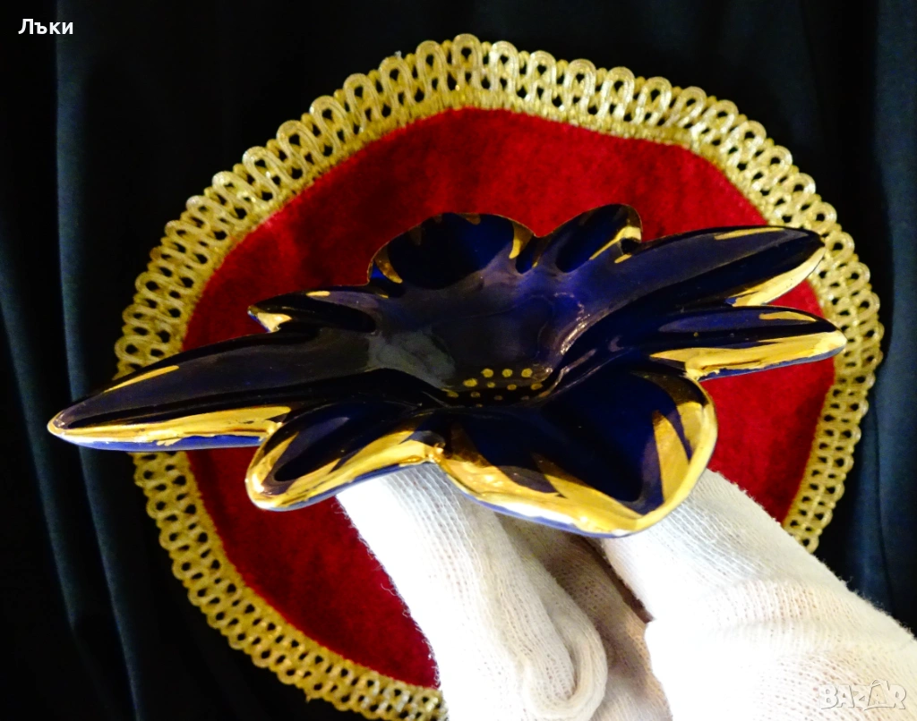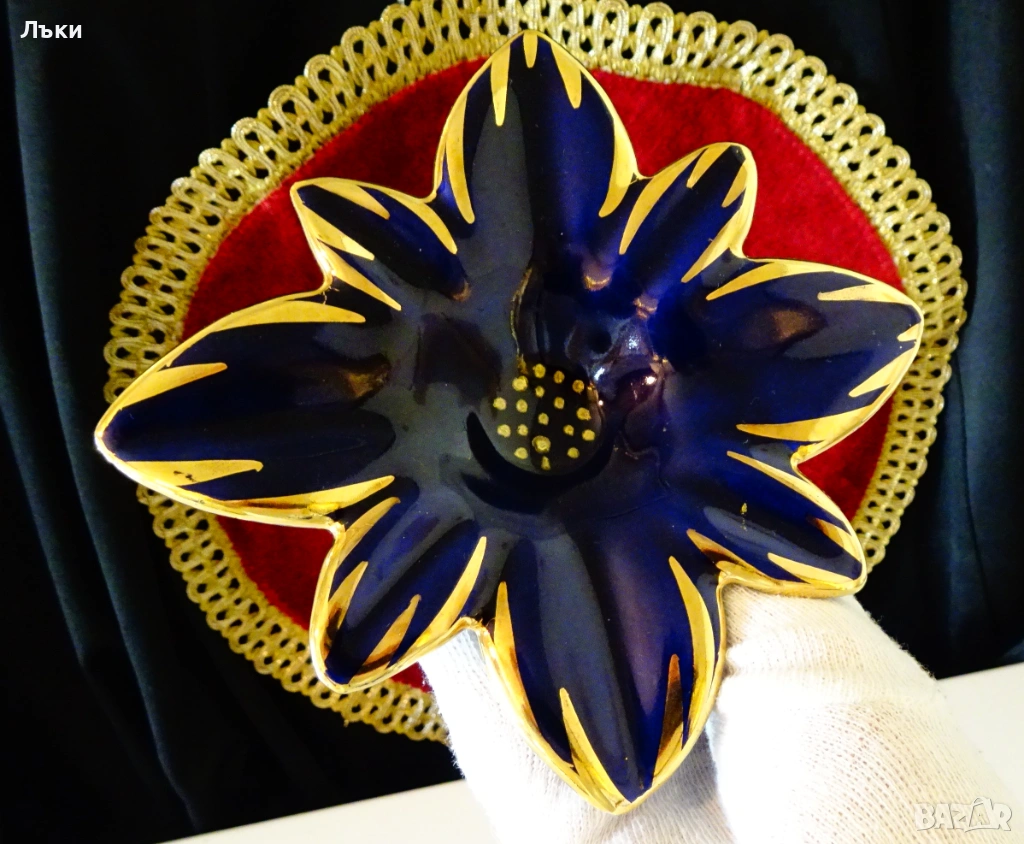 дизайн на разцъфнало цвете,декориран с много злато 24 карата на мастилено син