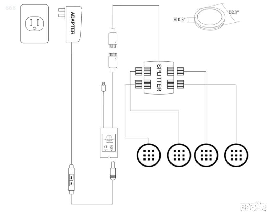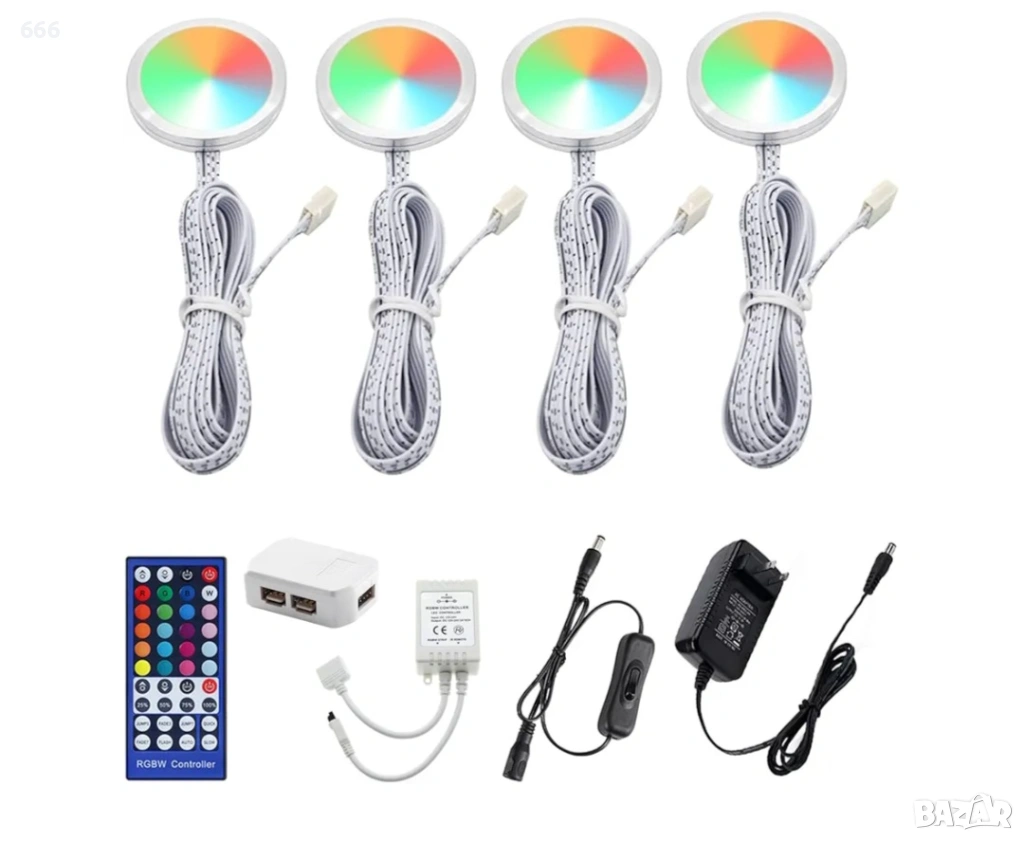 4 тънки кръгли алуминиеви светлини тип „шайба“ с 4-в-1 хъб и гъвкави кабели, лесно се монтират с 3M лепящи ленти.