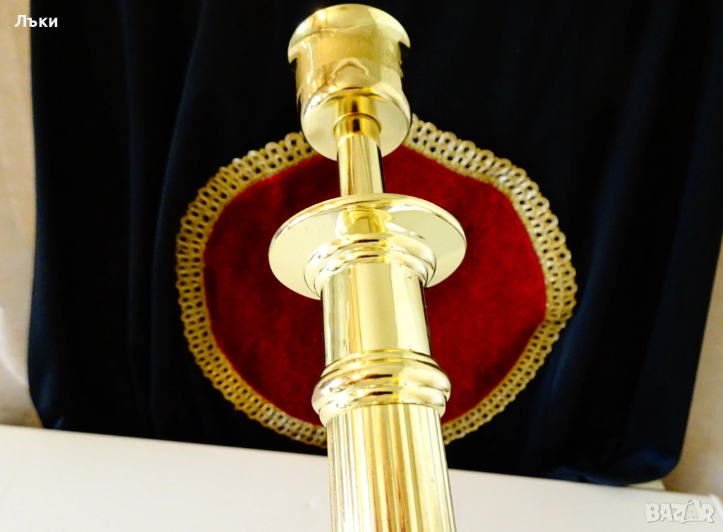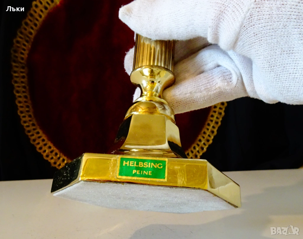 бронз,дебело позлатен с 24 карата злато.Има запазен етикет на производителя Helbsing Peine.Свещника е