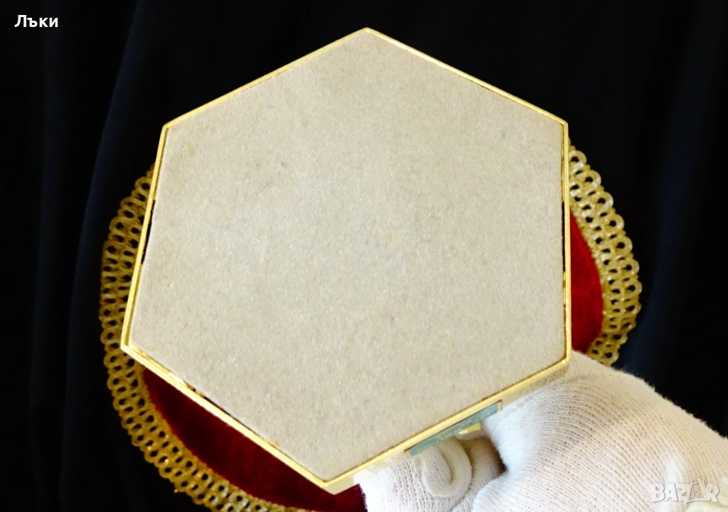 декориран с ефектен релеф в стил Art Deco.Основата има меко кадифе.Височина 29.5 см.,диагонал на
