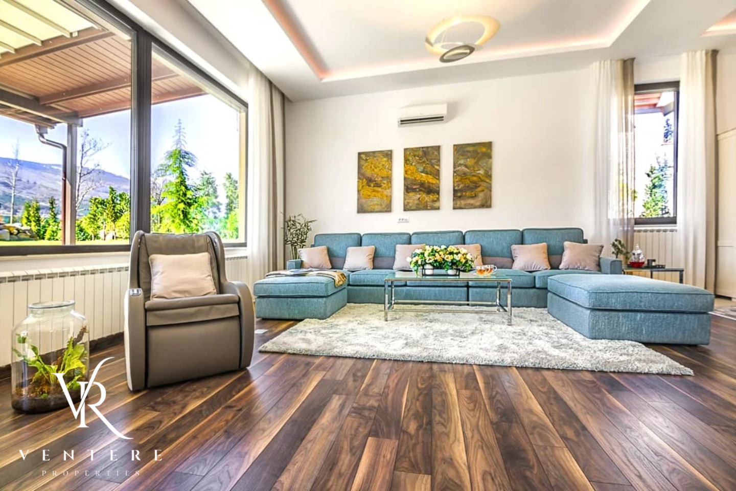 Къщата разполага с гараж за три автомобила.