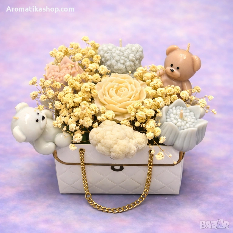 Композицията включва детайлни соеви цветя в кремави тонове, нежни сухи клонки с пухкав обем и няколко фигурки на мечета, които придават сладък, топъл и уютен характер. Букетът е подреден в стилна бяла чантичка с златна верижка — изключително елегантен завършек, който прави продукта модерен, специален и идеален за подарък.