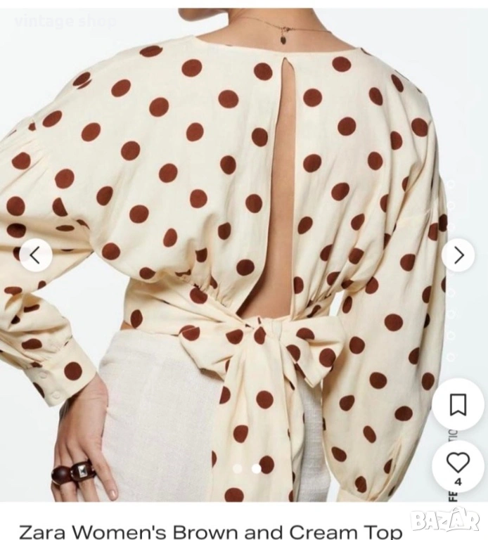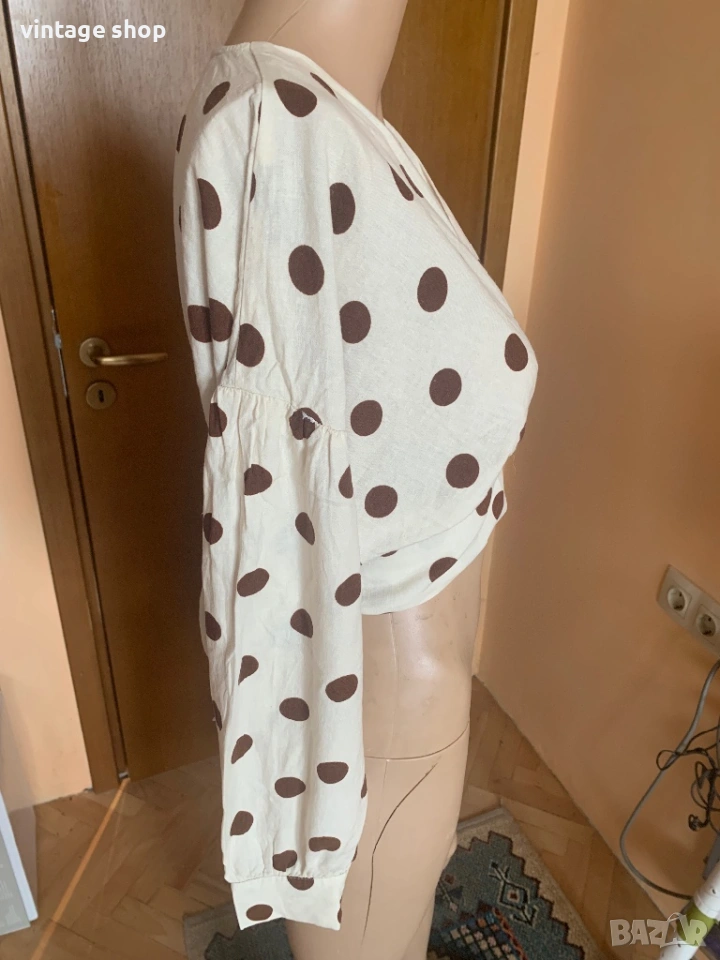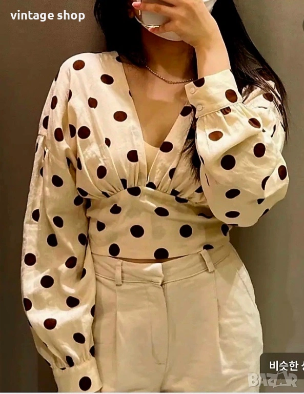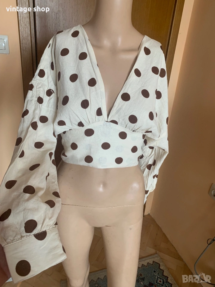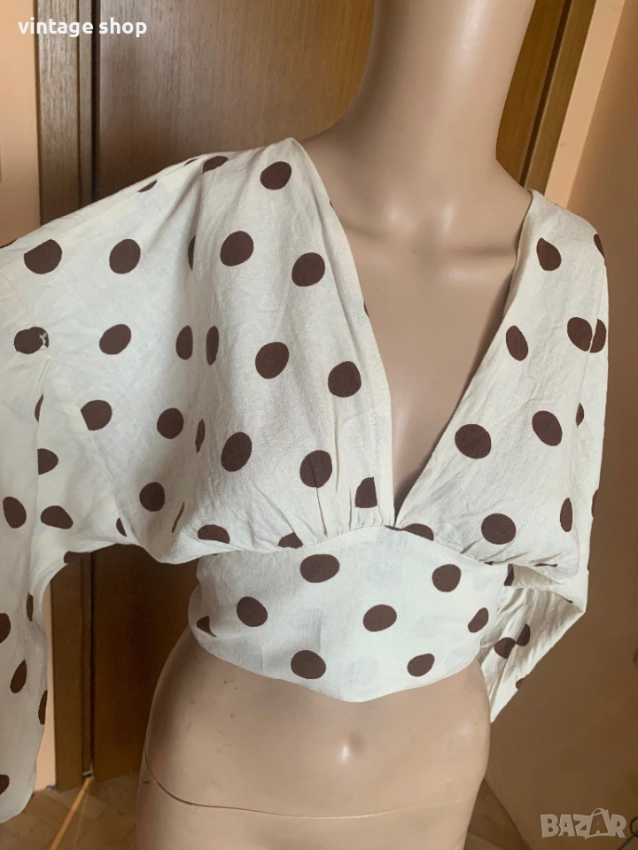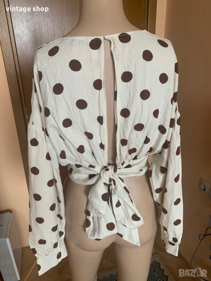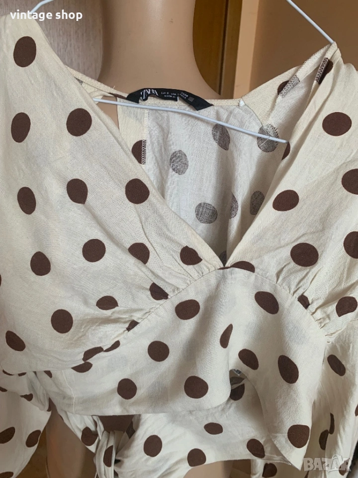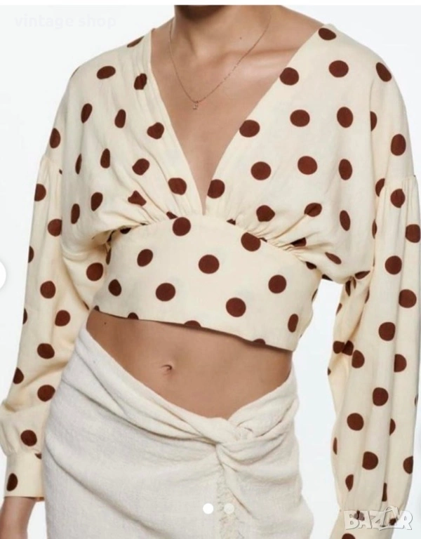 Разкошна блуза на Zara с непреходния десен на точки. Кройката е много кокетна и секси. С дълбоко изрязано деколте и с широка платка под бюста. С красиво загатнат гол гръб и връзки в задната част, които оформят ефектна пандела.