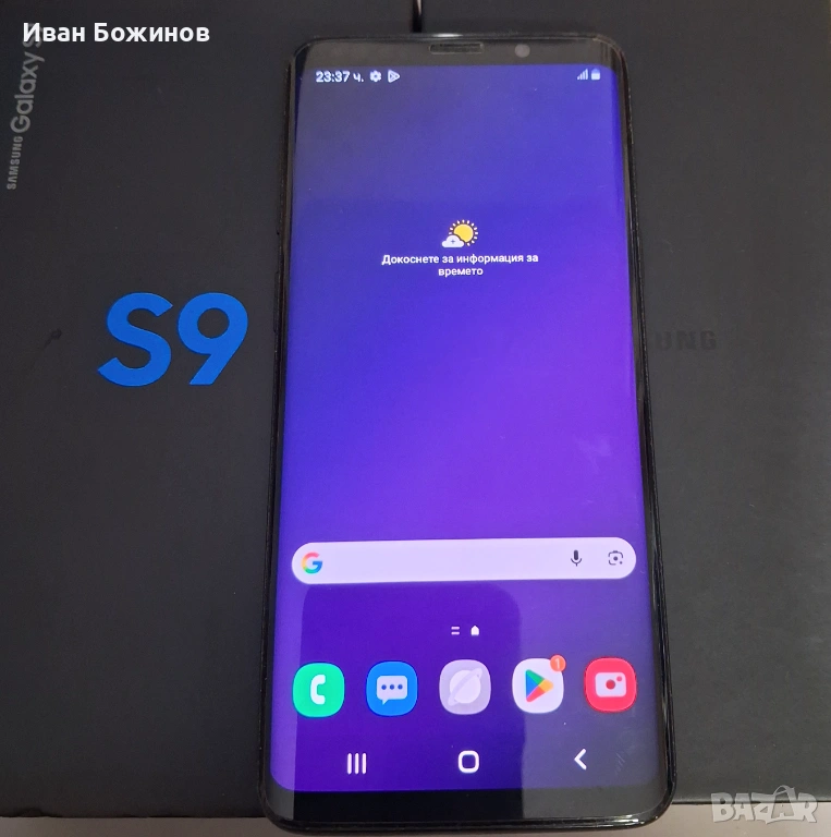 Samsung s9. БАТЕРИЯТА пада бързо. Много запазен, давам го с протектор, кейс и оригиналната кутия.