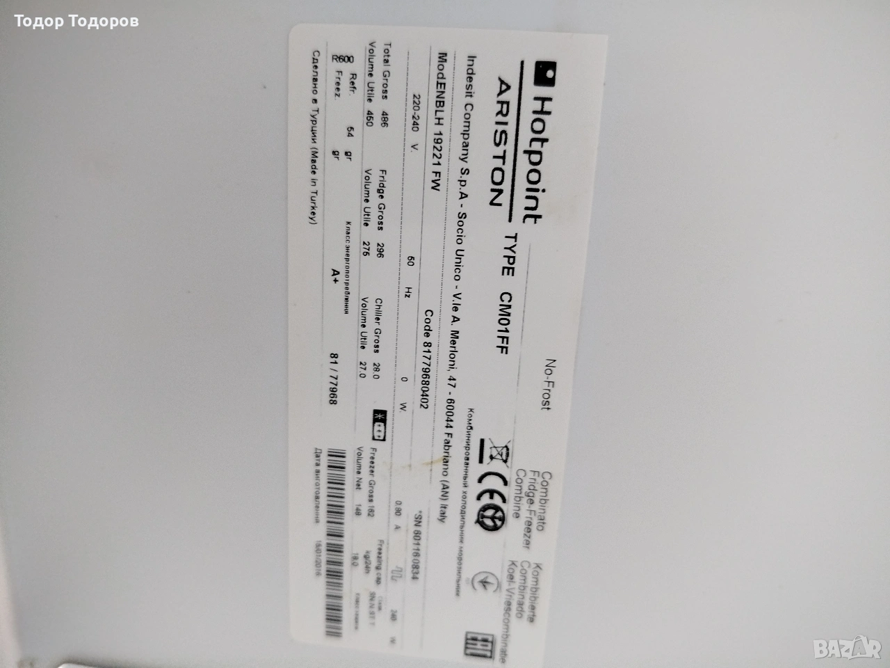 продавам голям хладилник с фризер Хотпойнт Аристон с ширина 70 см. саморазмразяващ се.