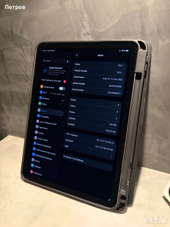 Не е за вярване колко е запазен този Ipad - даже и от Apple биха си го купили обратно, за да го продадат за ЧИСТО НОВ. Закупих го Септември, но не го използвам почти - едва на 77 цикъла е и реших да го продам. Продавам тази уникална комбинация от iPad Air M2 11” (2024) Space Gray 128 GB и предпазен калъф в състояние неразличимо от ЧИСТО НОВО. Както се вижда от снимките, таблетът е в перфектно състояние и няма дори и точица по него - нито по дисплея, нито по лайсните, нито по гърба. Абсолютно всичко си му работи безупречно!
