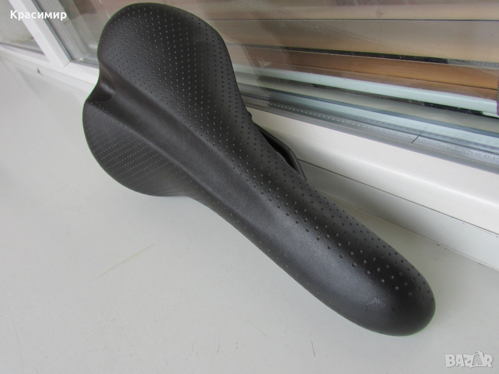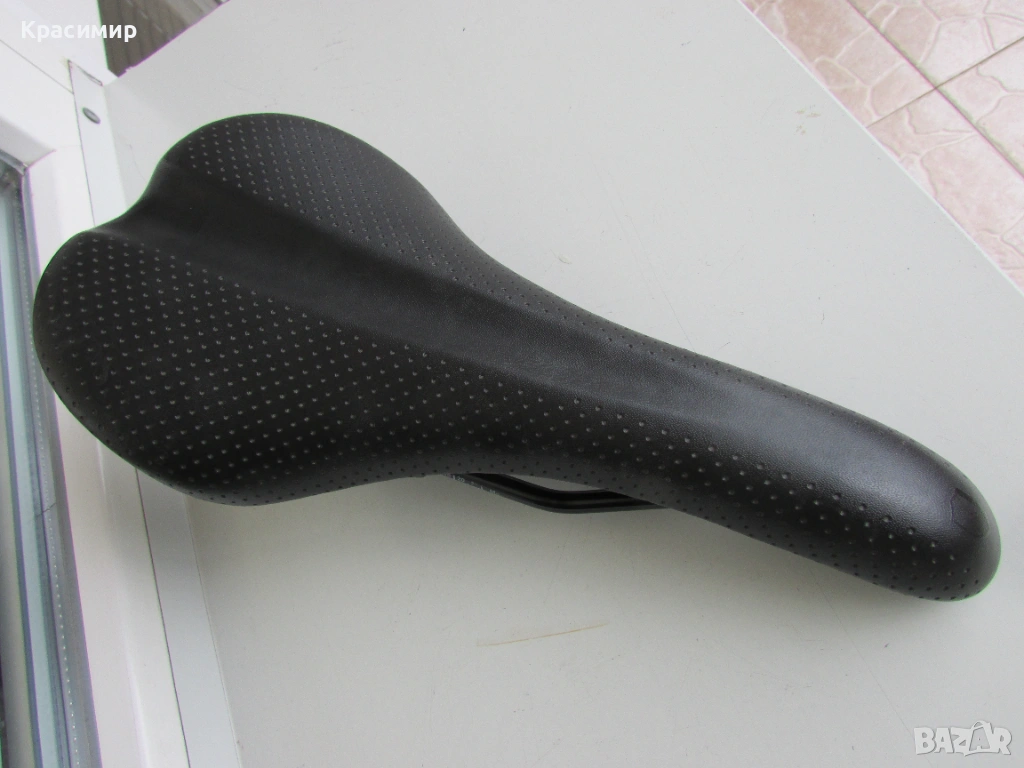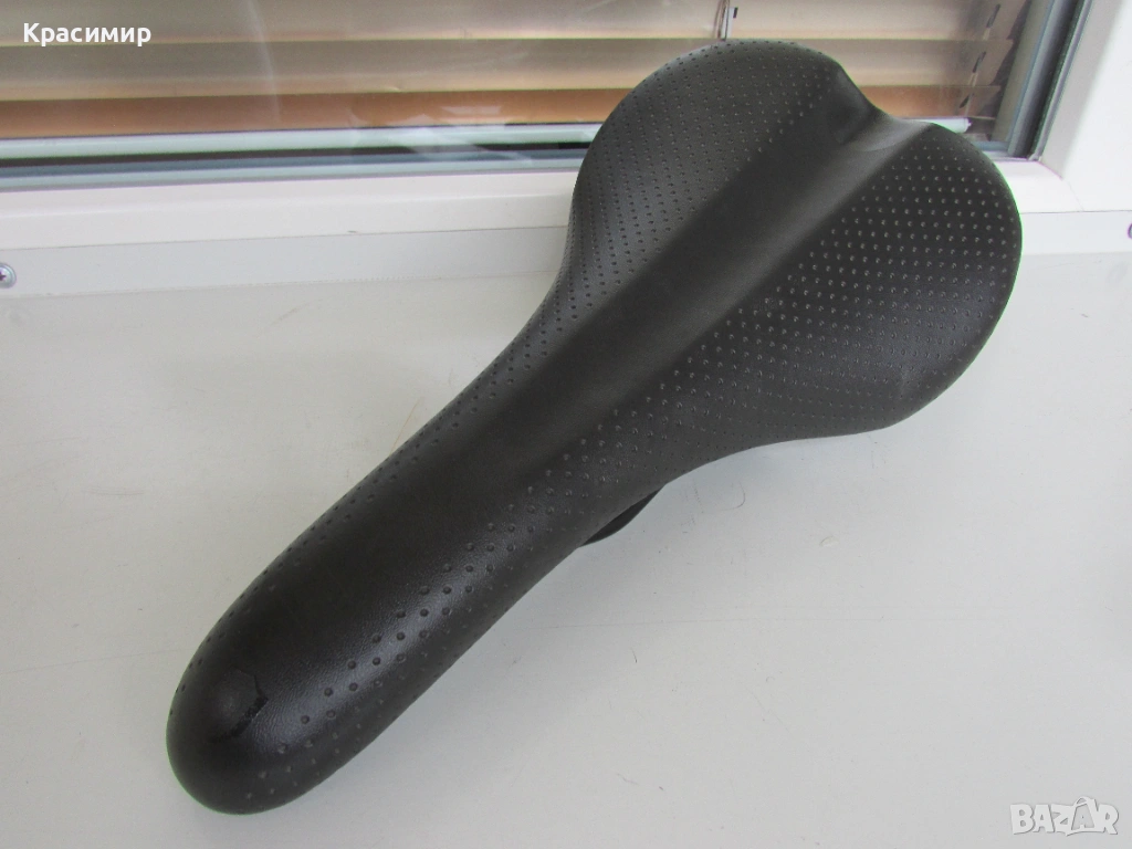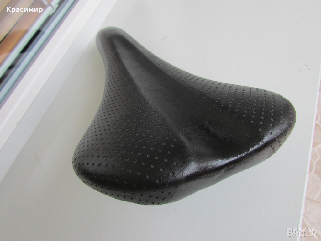 Спортна черна седалка за велосипед, с перфорирана кожа, в перфектно състояние. Размери: Дължина - 280 мм, Широчина - отпред - 40 мм, отзад - 140 мм.
