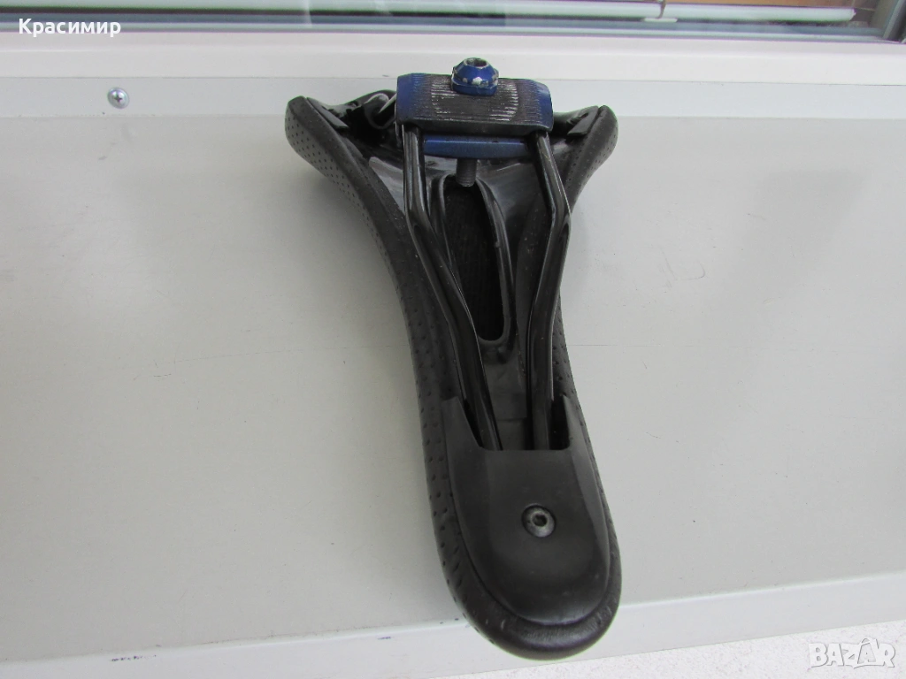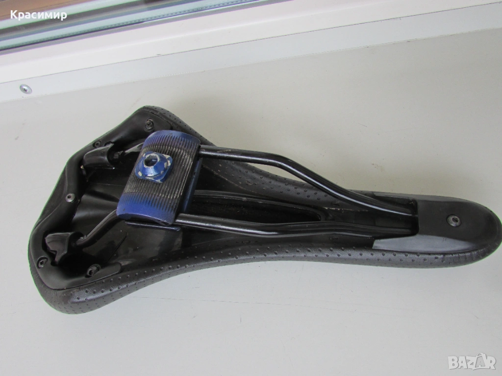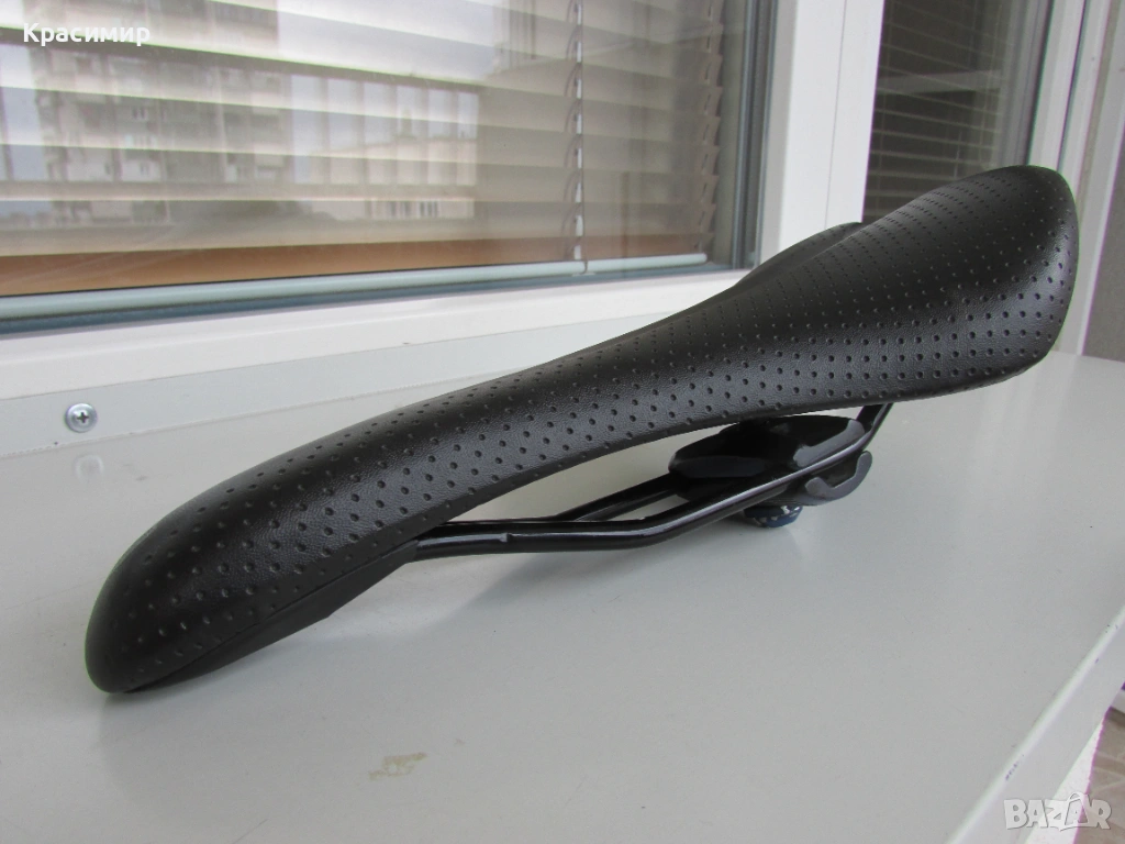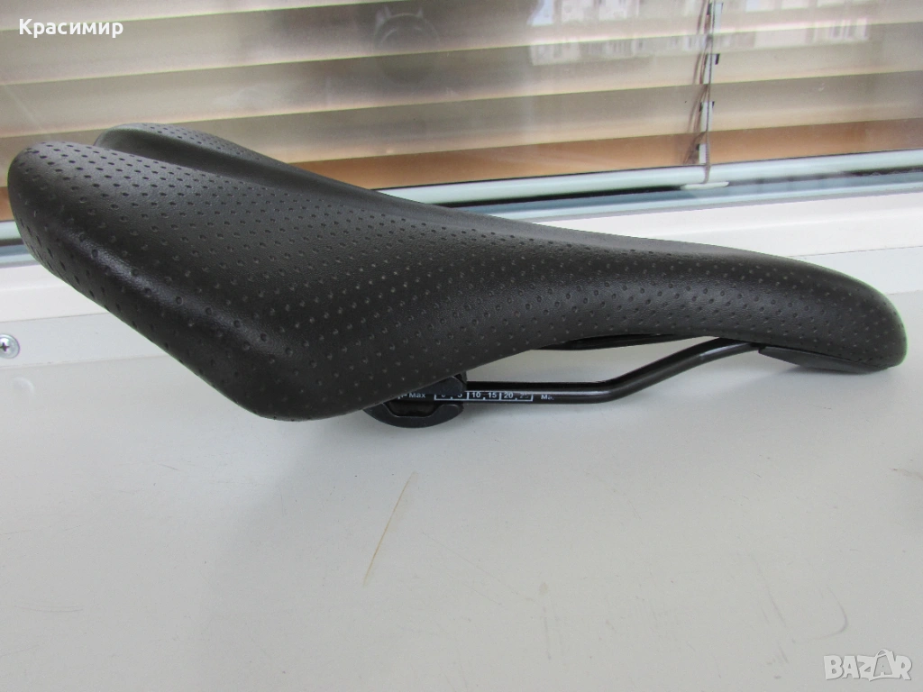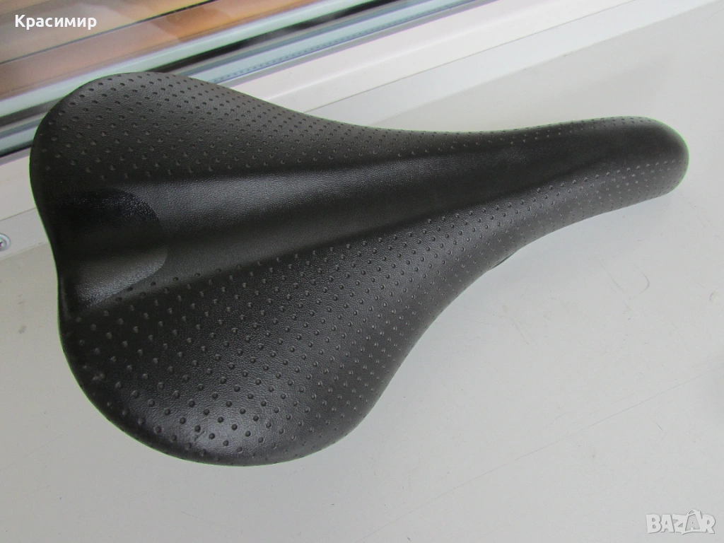 Спортна черна седалка за велосипед, с перфорирана кожа, в перфектно състояние. Размери: Дължина - 280 мм, Широчина - отпред - 40 мм, отзад - 140 мм.