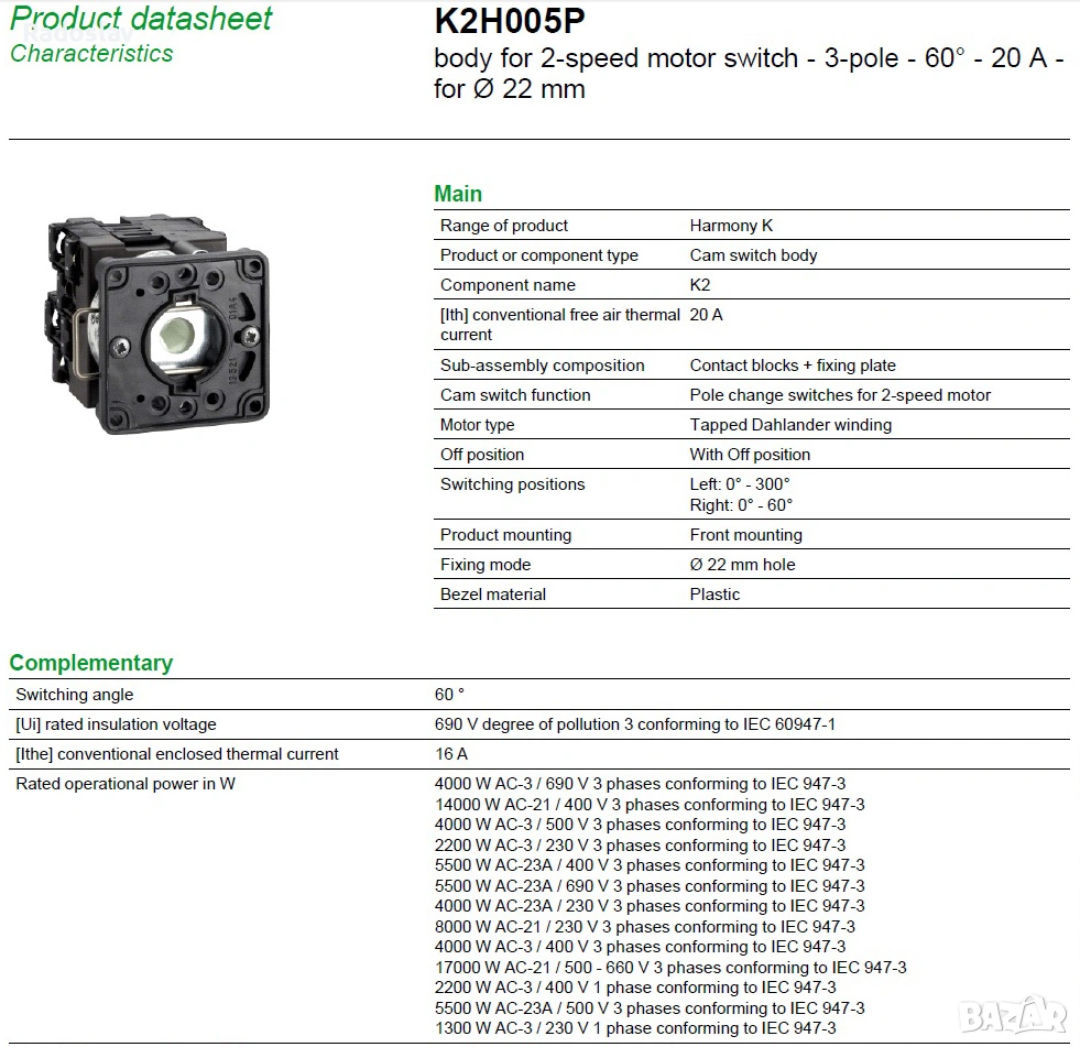 Пакетен прекъсвач Telemecanique K2H005P 20A/3-pole/60 degree - НОВ → Обява 53991554