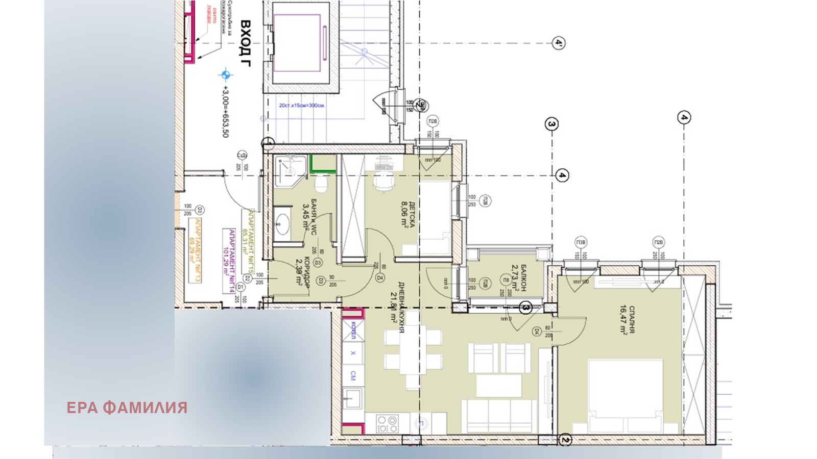ЕRA Фамилия продава чудесен тристаен апартамент (Г15) в новостроящ се жилищен комплекс със самостоятелно парково междублоково пространство. Комплексът е разположен с бърз излаз към Околовръстното шосе, в близост до големи търговски вериги. Апартаментът се намира на втори етаж в четириетажна сграда с модерна архитектура, голям асансьор, топла връзка с подземни гаражи и паркоместа и обособени пространства за велосипеди. В сградата са предвидени също общи помещения за охрана и офисни площи.