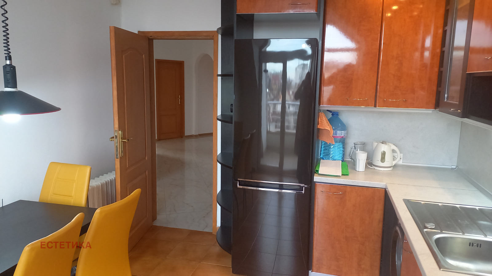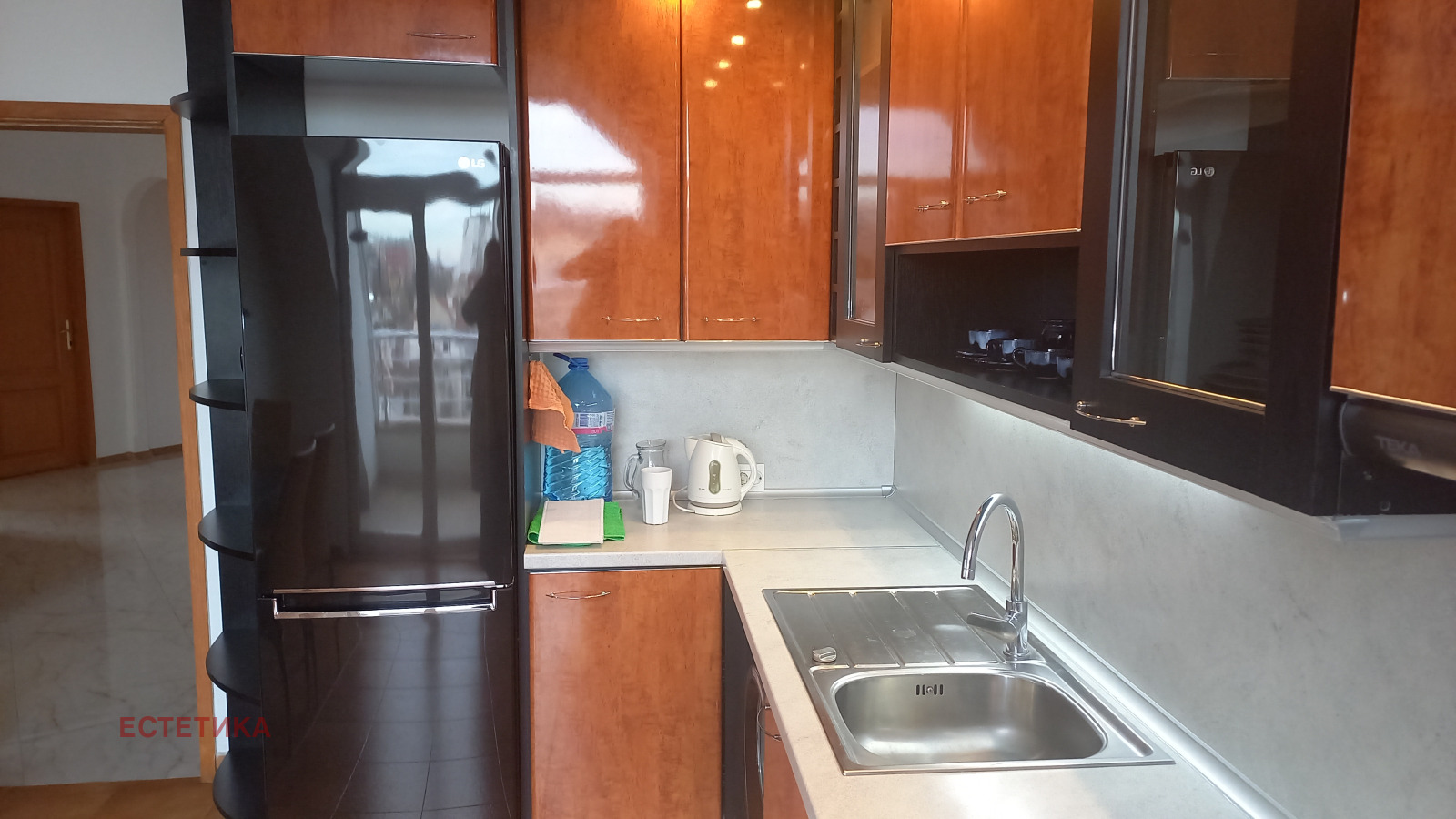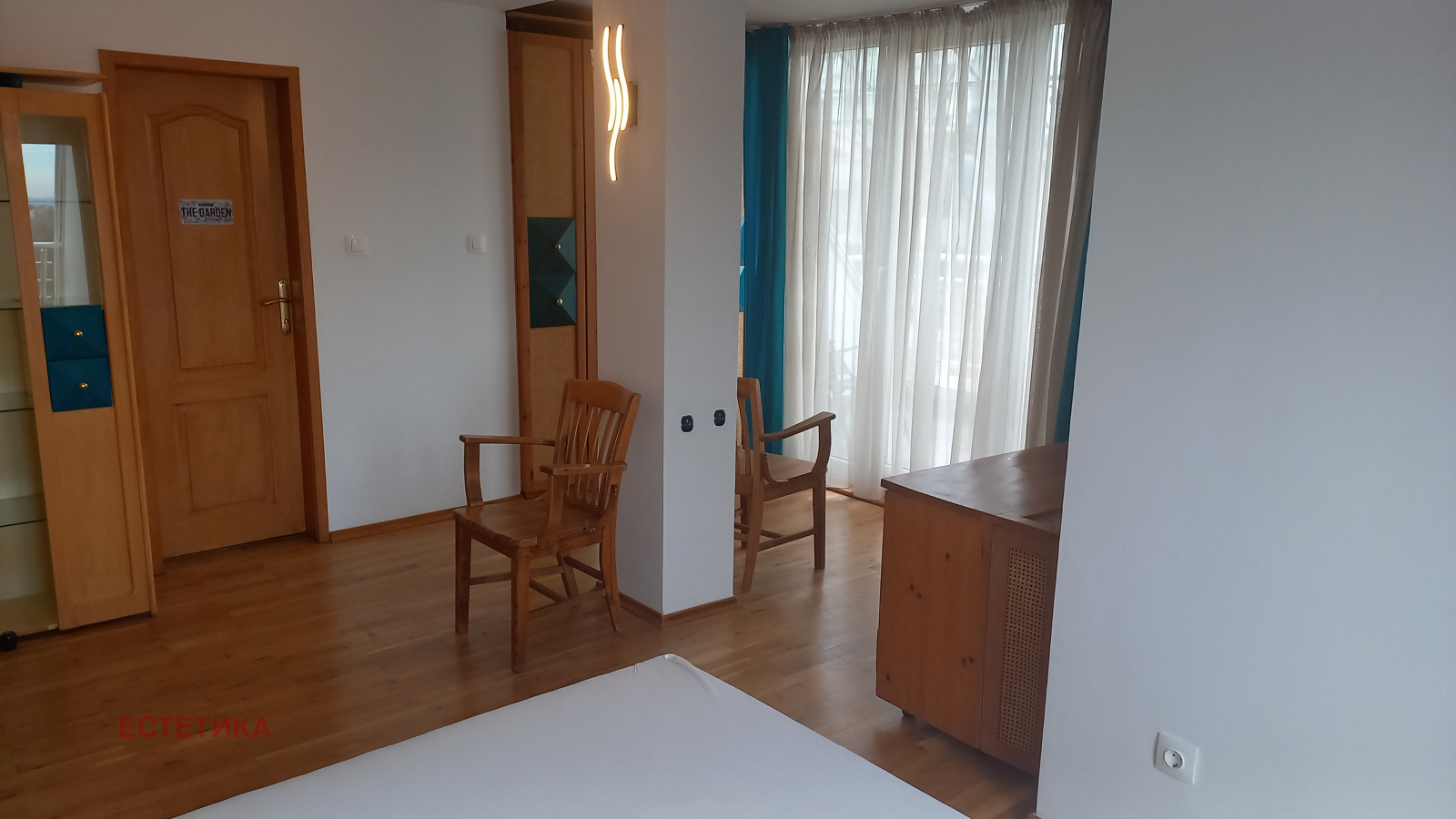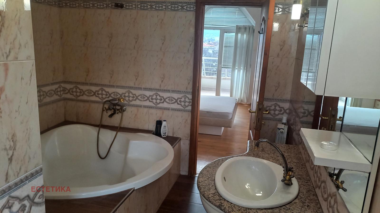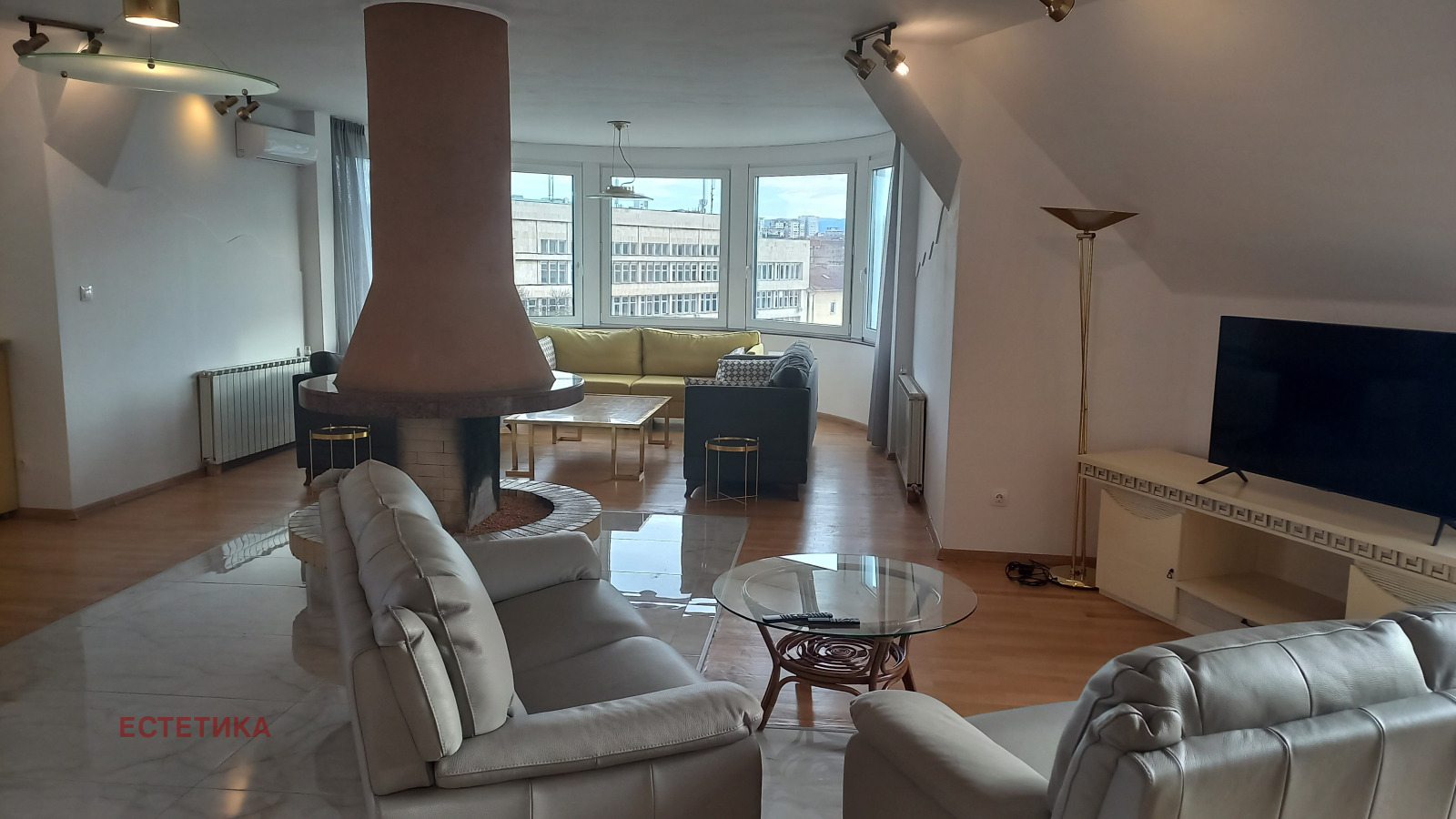 Разпределение: представително антре, дневна 70 кв.м. с мека мебел, кът камина, кът телевизия, трапезария и бар, самостоятелна кухня напълно оборудвана, тоалетна за гости, две спални всяка с баня и големи тераси, трета спалня или кабинет, килер. Апартавентът не е преходен, единствен на етажа с изложение: юг-изток и запад. Отоплението е на ТЕЦ, най-висок клас PVC дограма ( навсякъде ) има и климатици (навсякъде)
