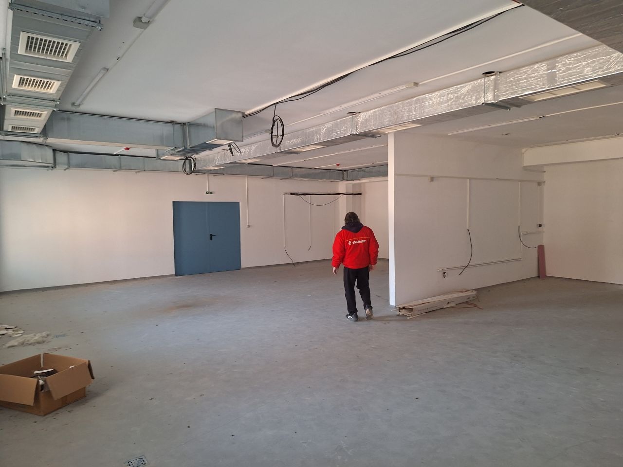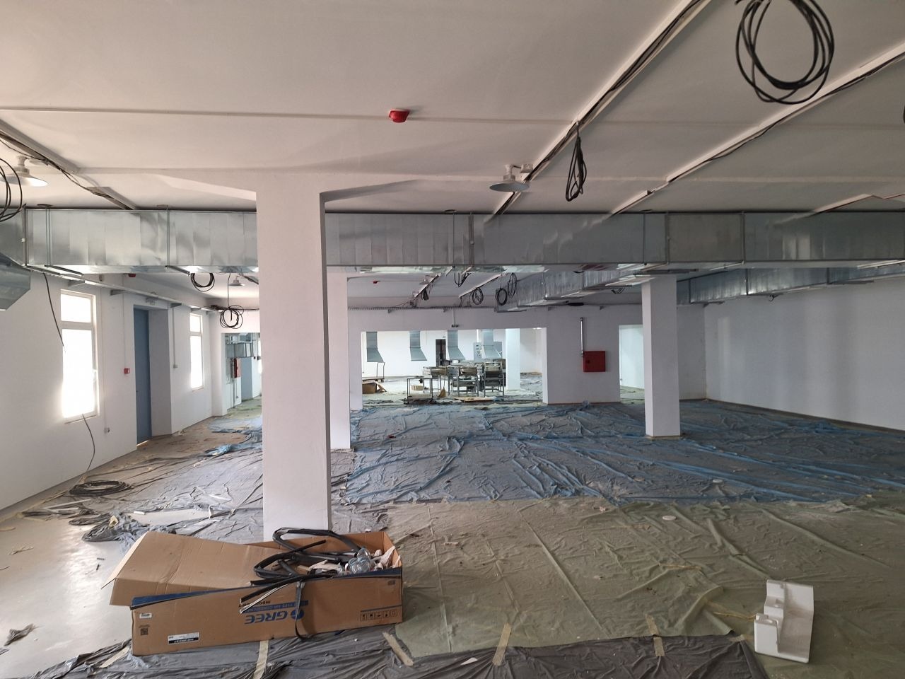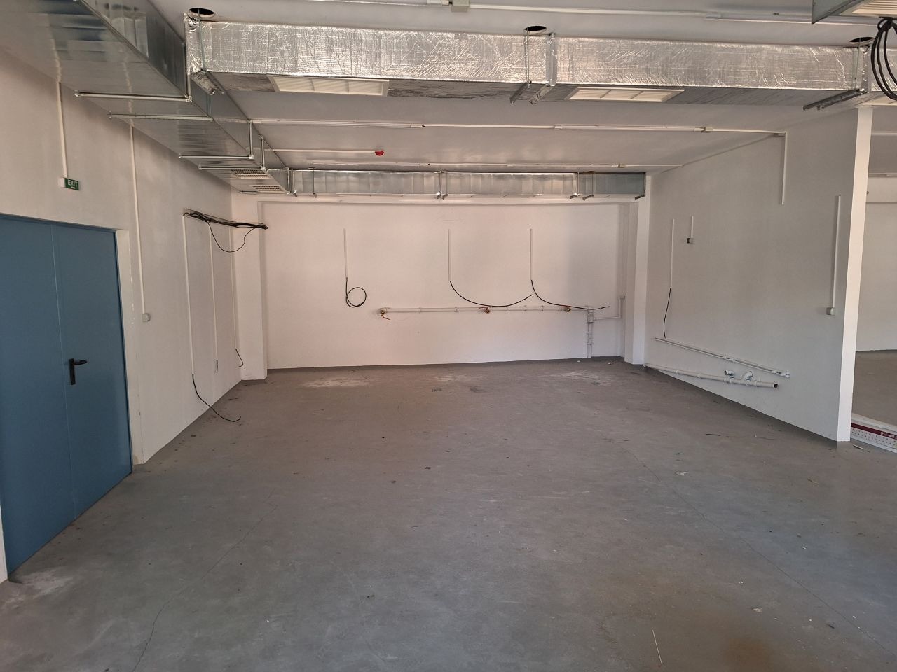 Първият етаж (застроена площ на етажа 1054 кв.м.) е разделен функционално на четири помещения свързани с плътни пожароустойчиви врати. Обособени 2 бр. офисни помещения.