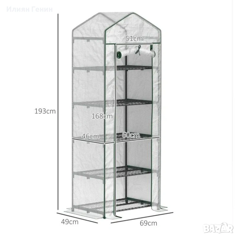 Детайли за продукта за оранжерията за домати: Общи размери: 69Д x 49Ш x 193В см; Размери на вратата: 51Ш x 168В см; Размери на рафта: 60Д x 46Ш см; Височина на всеки рафт: 32 см; Тегло на всеки рафт: 15 кг