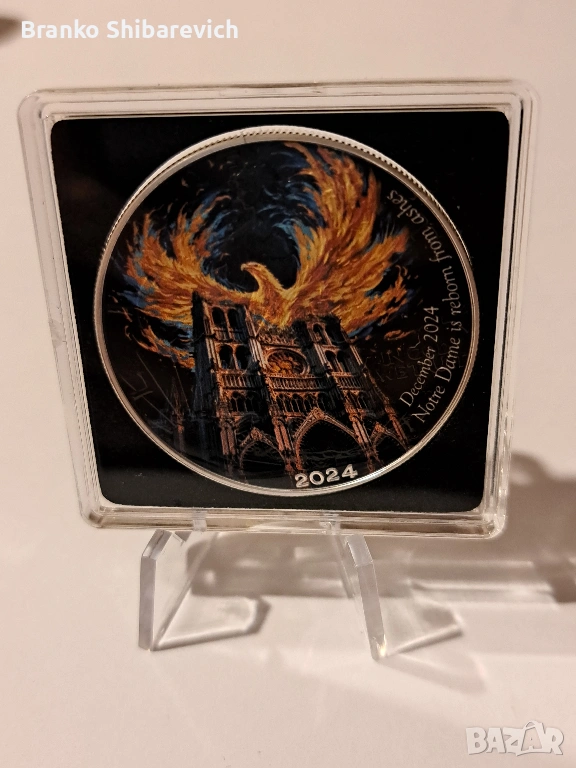 Предлагам красива и рядка колекционерска монета 1oz ( ag.999 ) , 100 бр.тираж, впечатляващ цветен дизайн-феникс над катедралата Notre Dame ( символ на възраждането ).