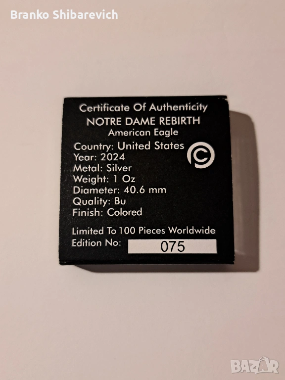 Сребърна монета American Silver Eagle 2024- Notre DameRebirth Edition , mintage 100 → Обява 53992032