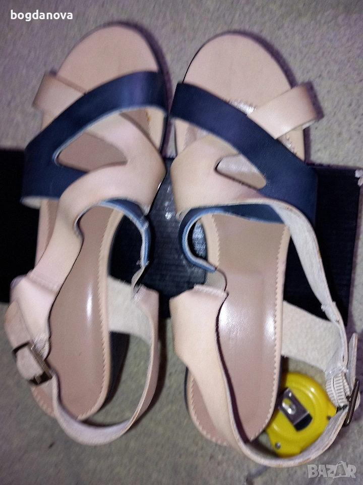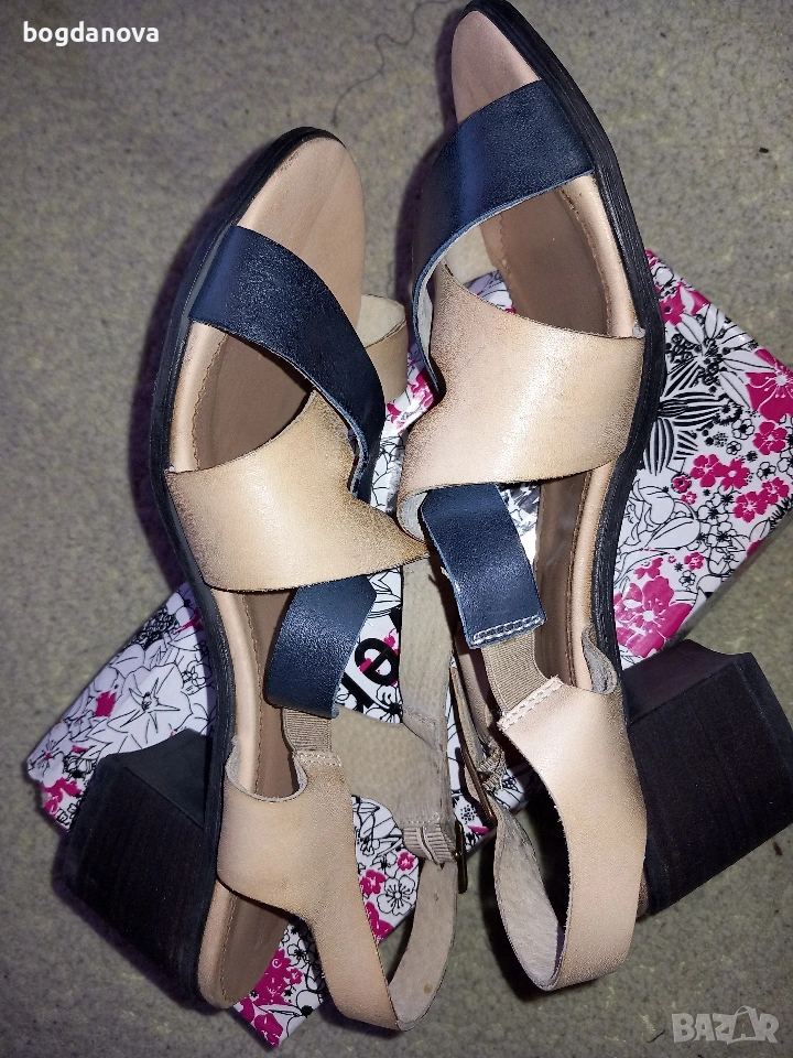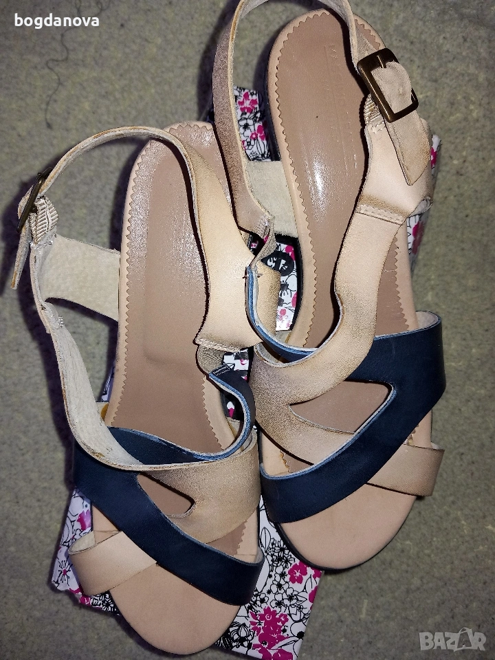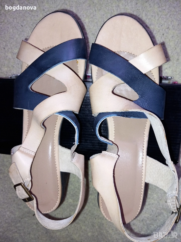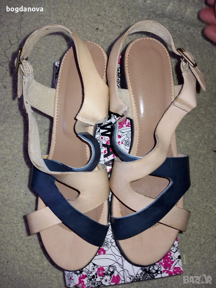 Нови елегантни маркови сандали от естествена кожа, размер 40, в цвят бежов с тъмносин. Стилен избор за лятото! Чисто нови, необувани, без тяхна кутия. Получавате ги с преглед и тест с избран от Вас куриер или с лично предаване. Подходящи са и за по-широк крак, 39 номер.